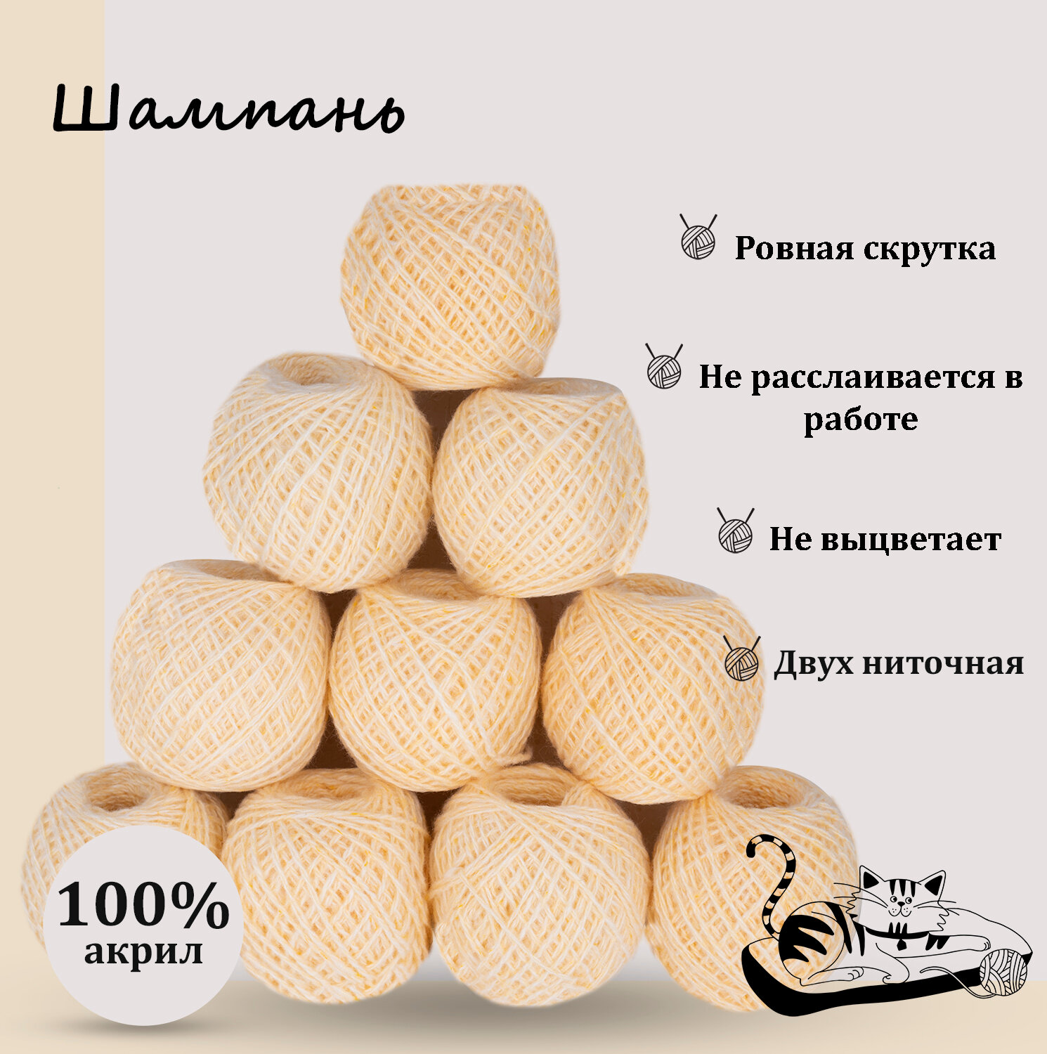 Купить Пряжа для ручного вязания в клубочках. Набор 10 штук. Моток 40 грамм / 70 метров. Шампань