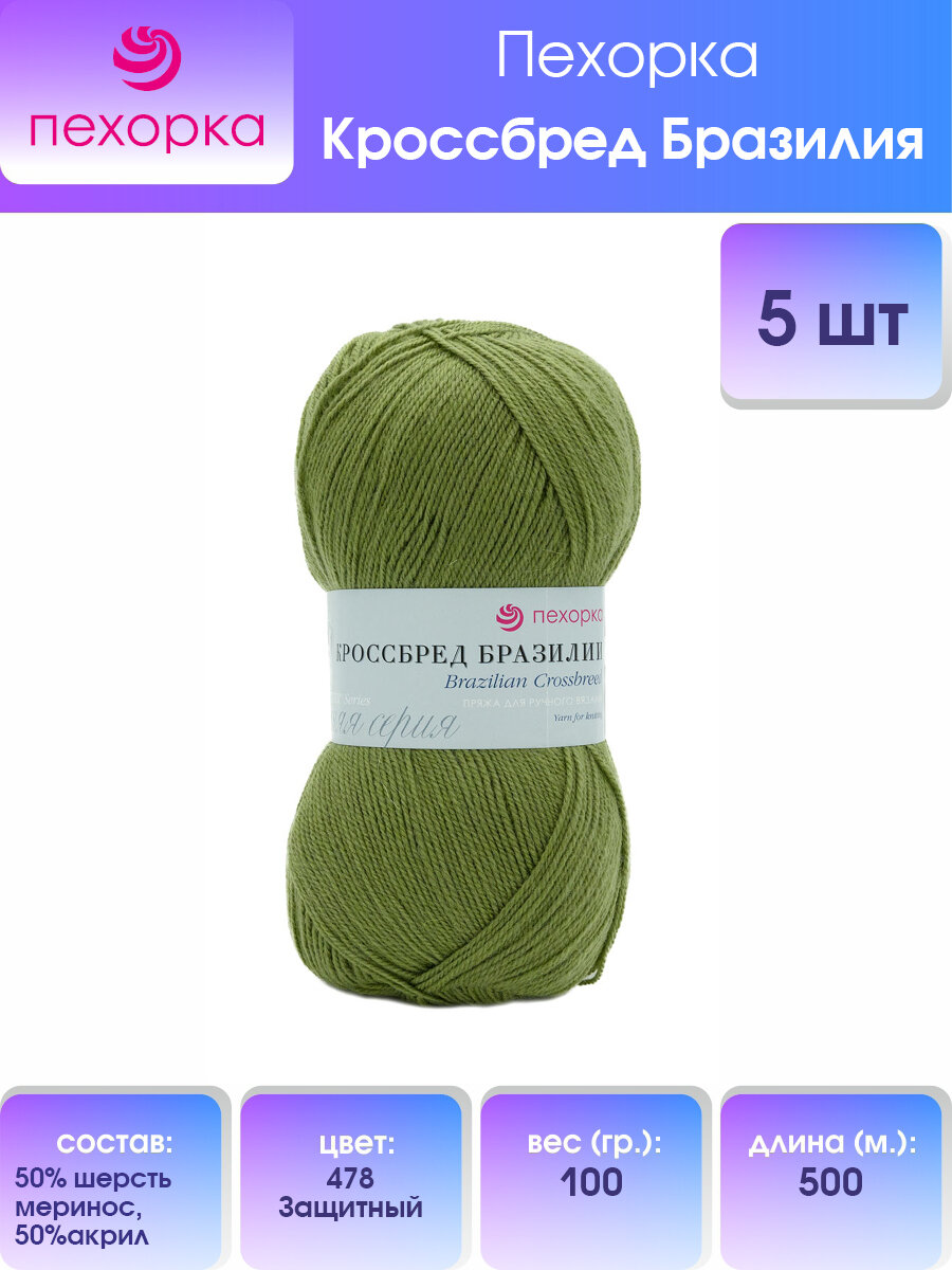 Пряжа детская, полушерсть Пехорка, Pehorka Кроссбред Бразилии, тонкая, шерсть мериносовая, акрил, цвет 478, защита, 5 шт. по 100 г, 500 м