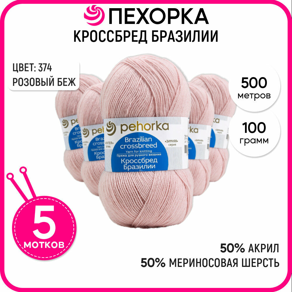 Пряжа Пехорка Кроссбред Бразилии розово-бежевый (374), 50%акрил/50%шерсть мериноса, 500м, 100г, 5шт