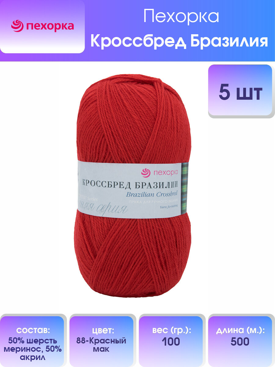 Купить Пряжа для вязания Пехорка 'Кроссбред Бразилии', 100 г, 500 м (50% шерсть мериносовая, 50% акрил) (88 Красный мак), 5 мотков
