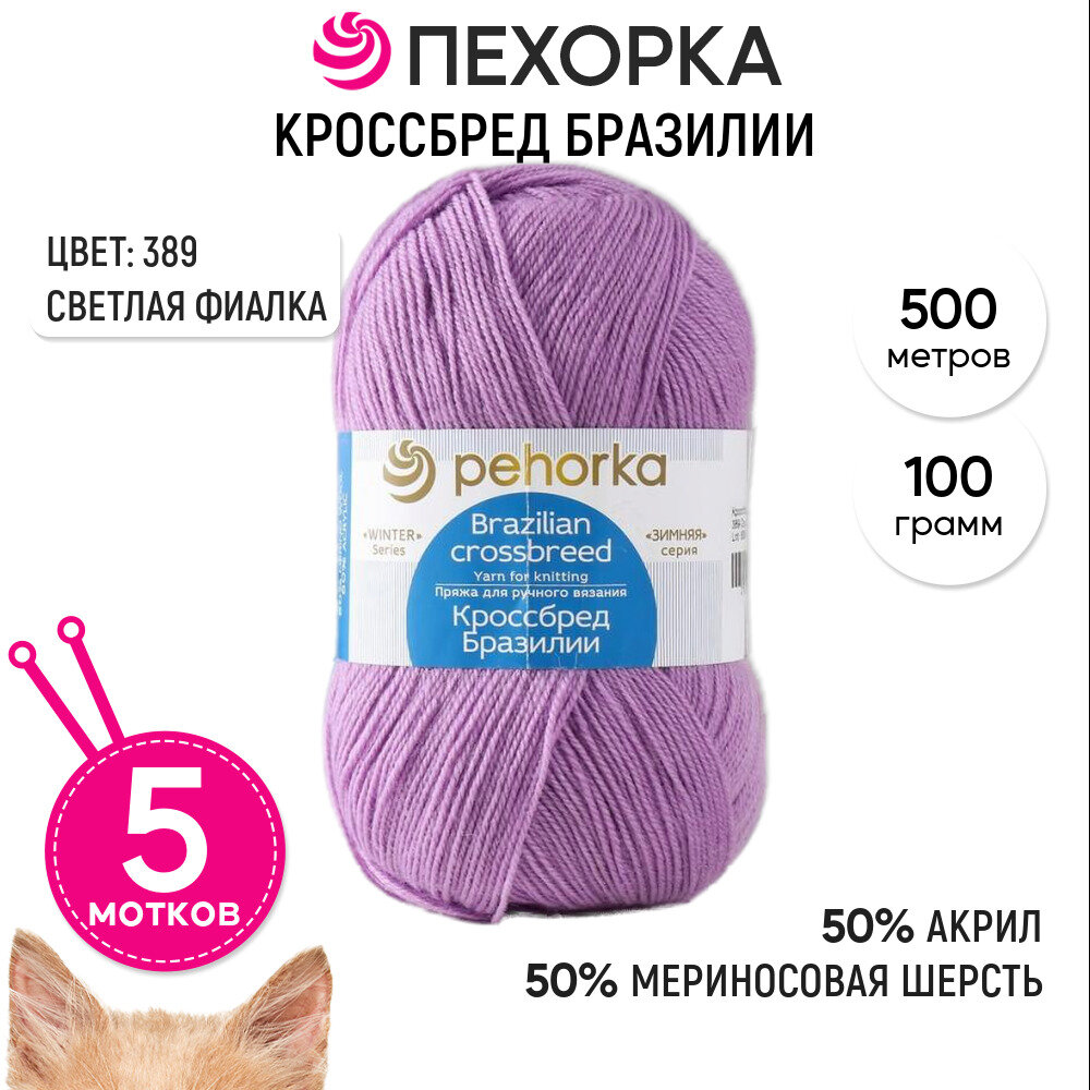 Пряжа Пехорка Кроссбред Бразилии светлая фиалка (389), 50%акрил/50%шерсть мериноса, 500м, 100г, 5шт