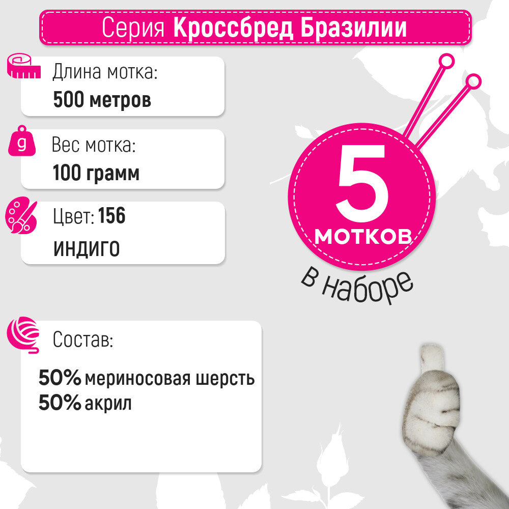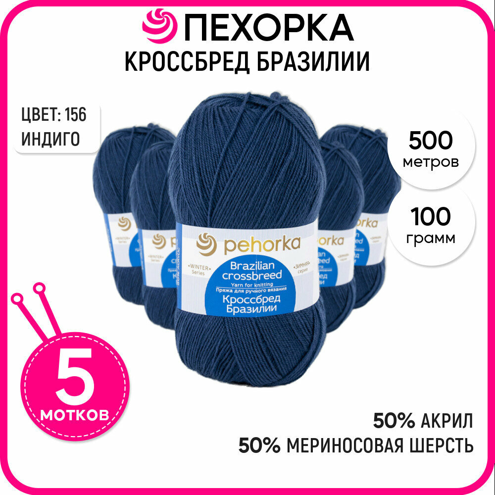 Купить Пряжа для вязания Пехорка 'Кроссбред Бразилии', 100 г, 500 м (50% шерсть мериносовая, 50% акрил) (156 Индиго), 5 мотков
