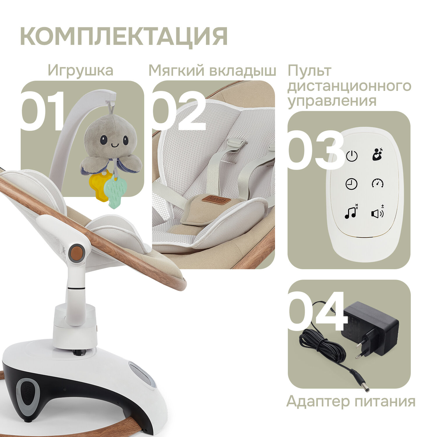 | Комплектация | электрокачель, адаптер питания, подвесная игрушка, пульт ДУ. Вкладыш в комплекте (3D-сетка) |