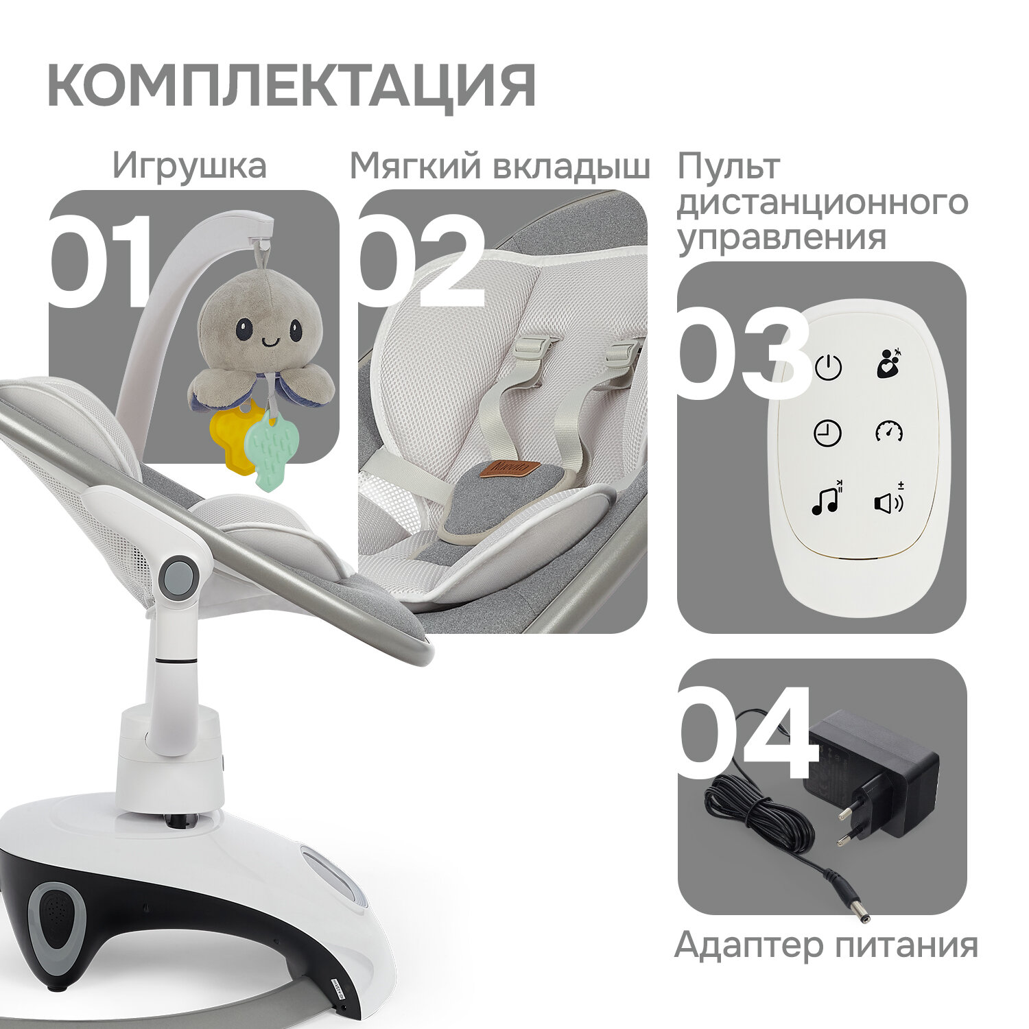| Комплектация | электрокачель, адаптер питания, подвесная игрушка, пульт ДУ. Вкладыш в комплекте (3D-сетка) |