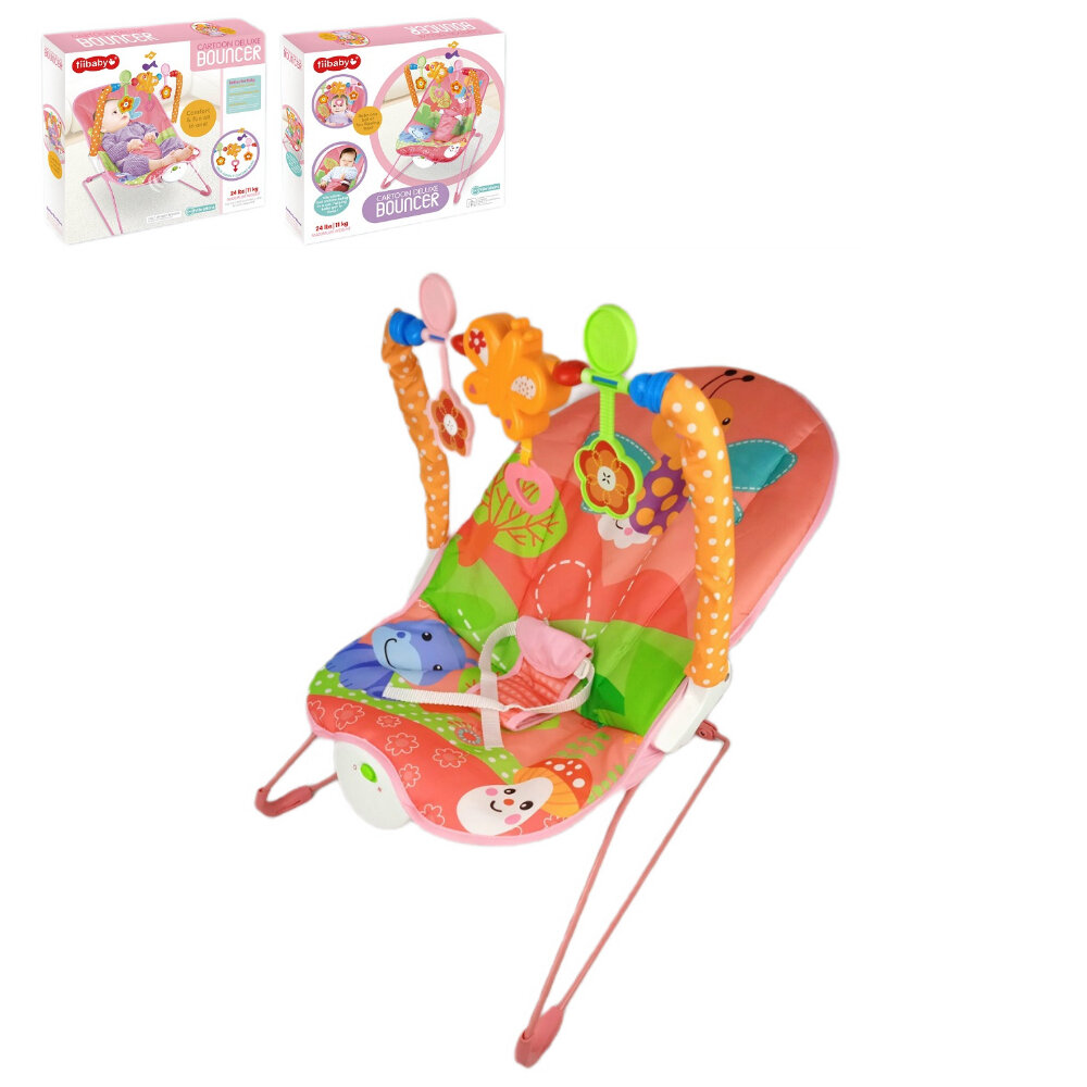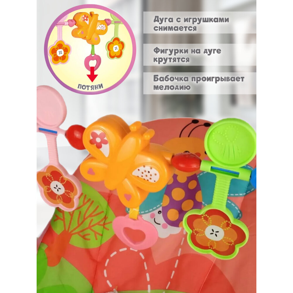 Купить Детский шезлонг кресло розовый с вибрацией, до 11 кг, дуга с погремушками, музыкальная игрушка