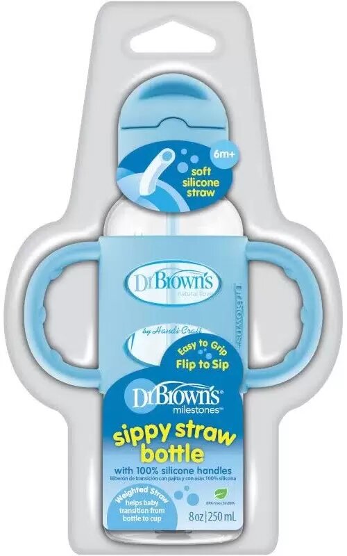 Купить Бутылочка-поильник Dr. Brown's с узким горлышком с силиконовой трубочкой и грузиком 250 мл, с ручками, Синяя