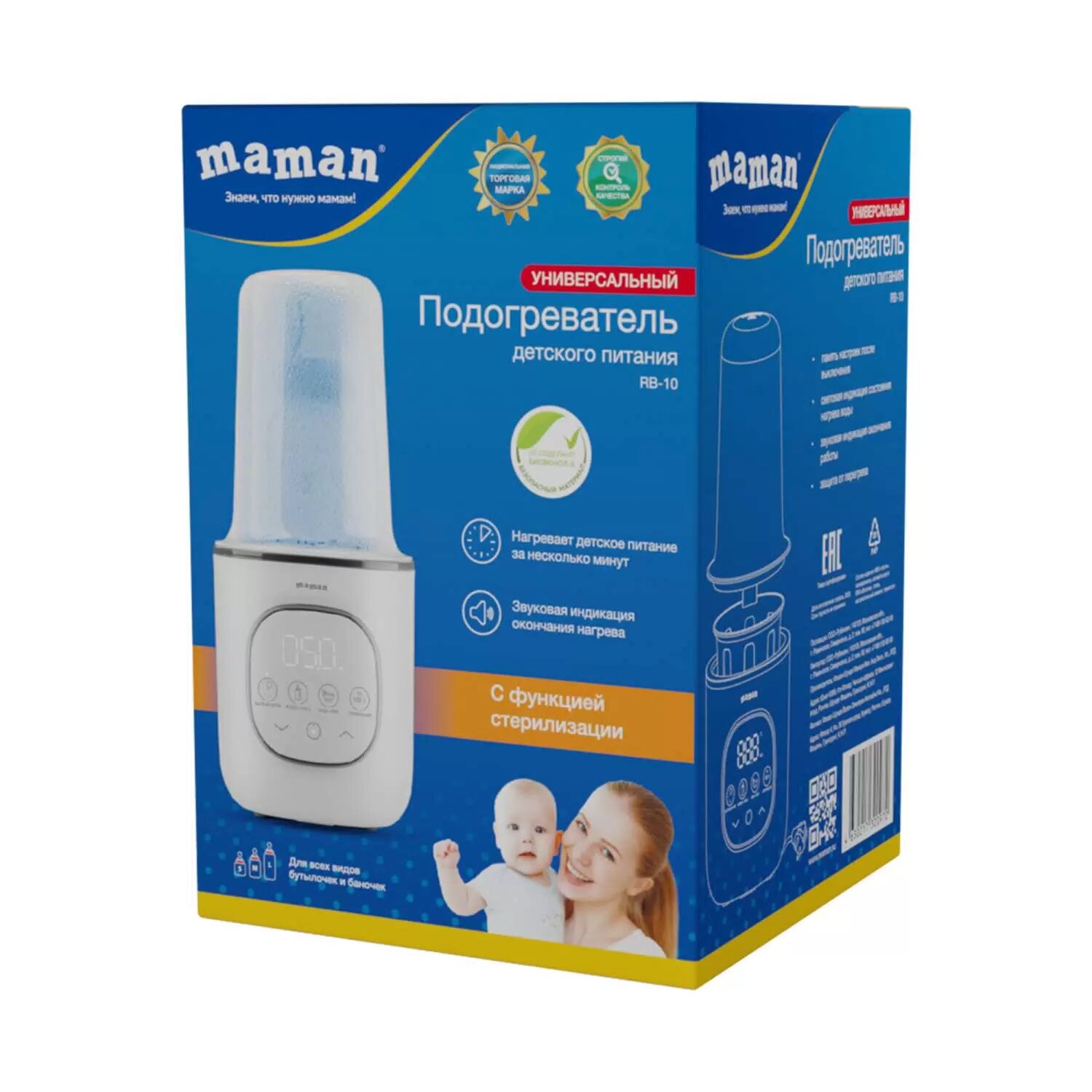 Электронный подогреватель Maman RB-10, функция стерилизации, дисплей с сенсорными кнопками, автоподдержание температуры