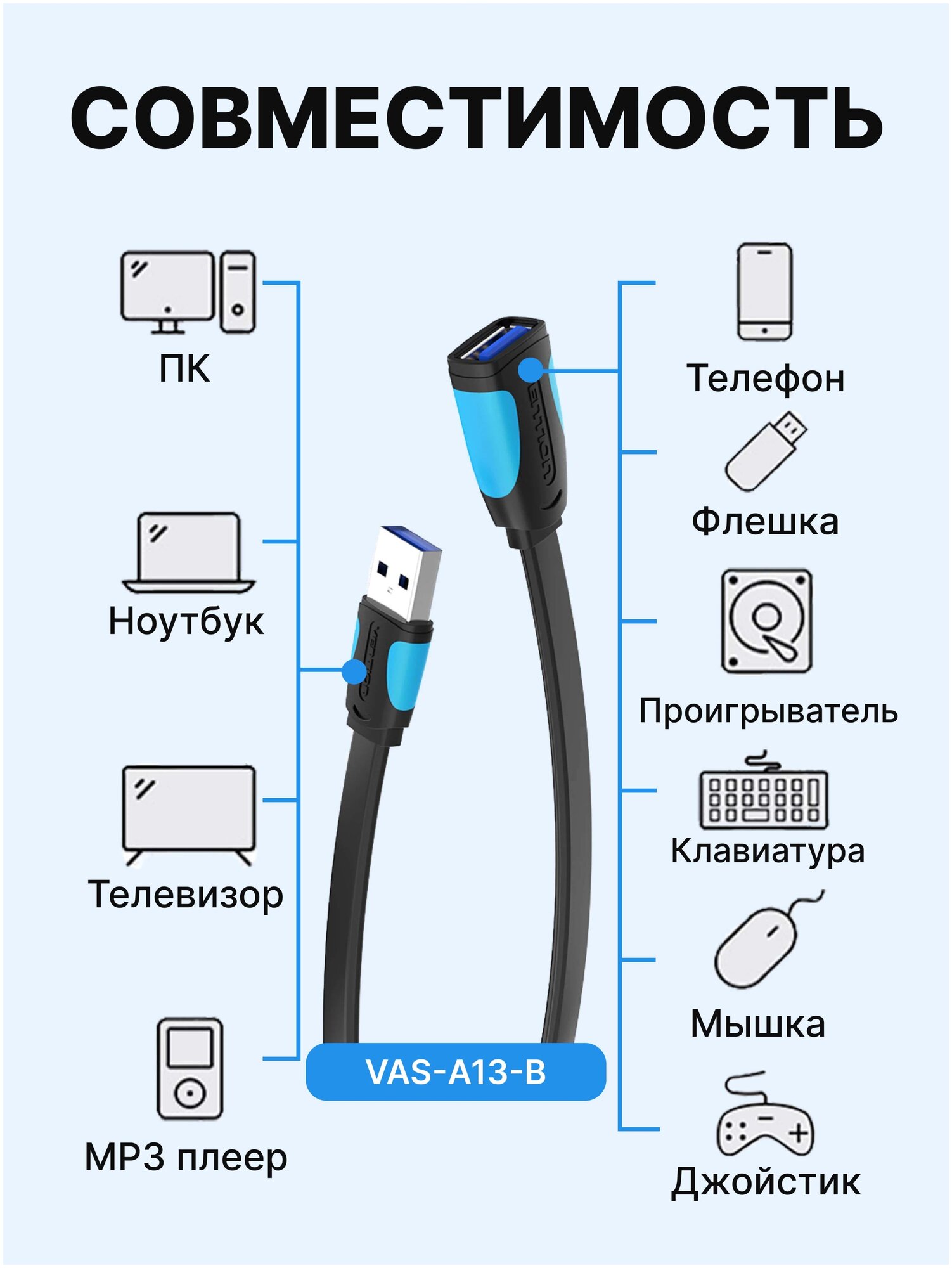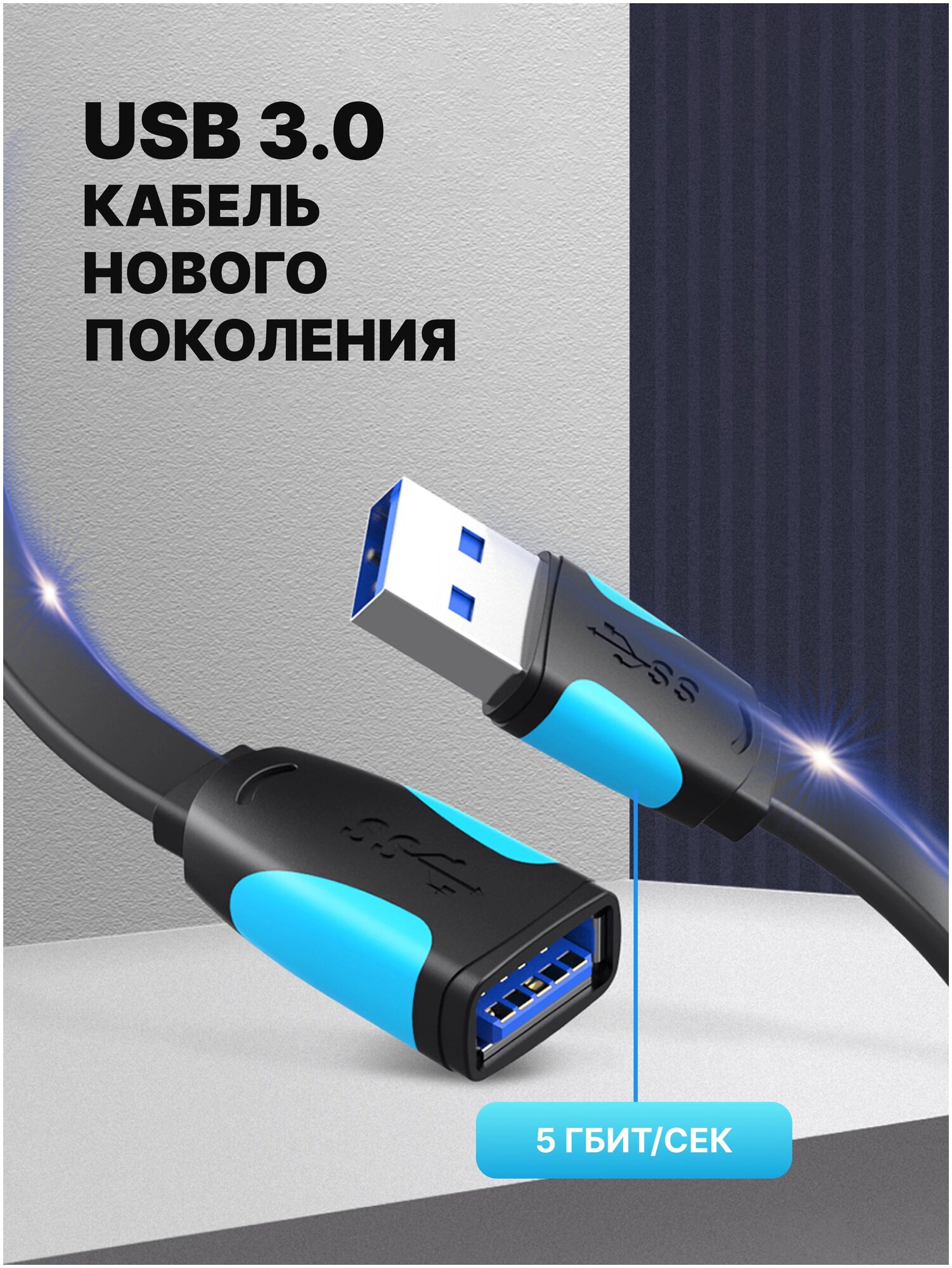 VAS-A13-B100, Vention USB 3.0 AM/AF - 1м, Кабель-удлинитель Vention USB 3.0 AM/AF - 1м плоский
