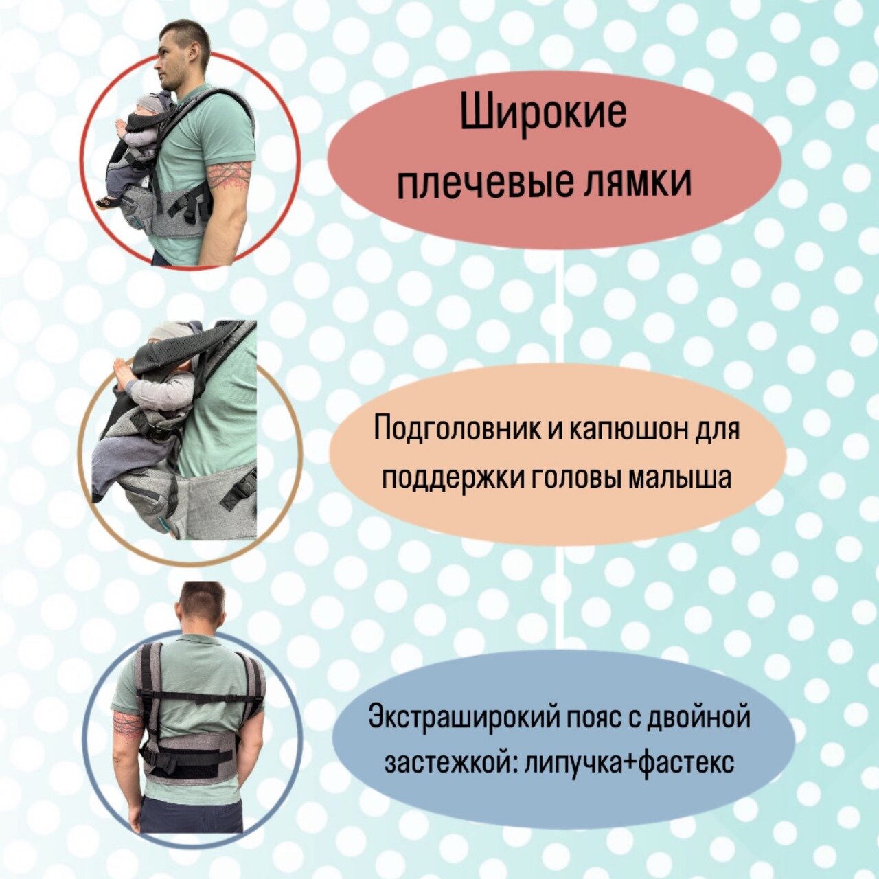 | Дополнительная информация | всесезонный, дополнительный карман, поддержка родительской спины, регулируемая длина ремня, регулируемые боковые ремни, страховочные резинки, эргономичный разрез. |