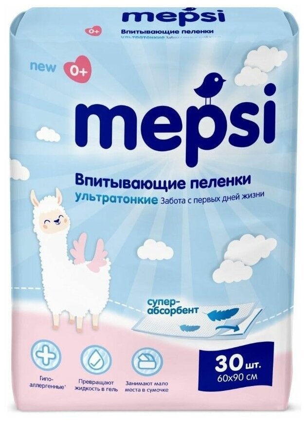 Пеленки одноразовые MEPSI детские впитывающие, 60х60, 30 шт, для новорожденных, малышей, собак ультратонкие, с абсорбентом