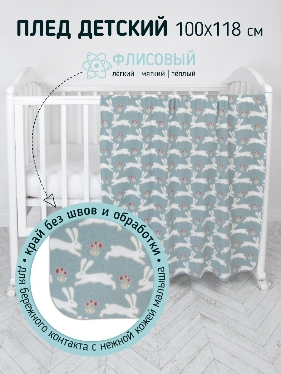 Плед для новорожденного 100х118 флисовый детский в кроватку коляску, "Зайки "