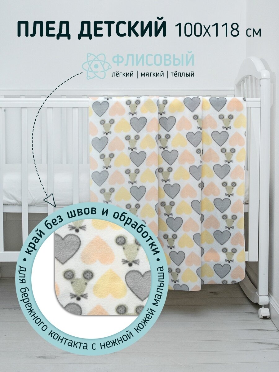 Плед для новорожденного 100х118 флисовый детский, " Мышки"