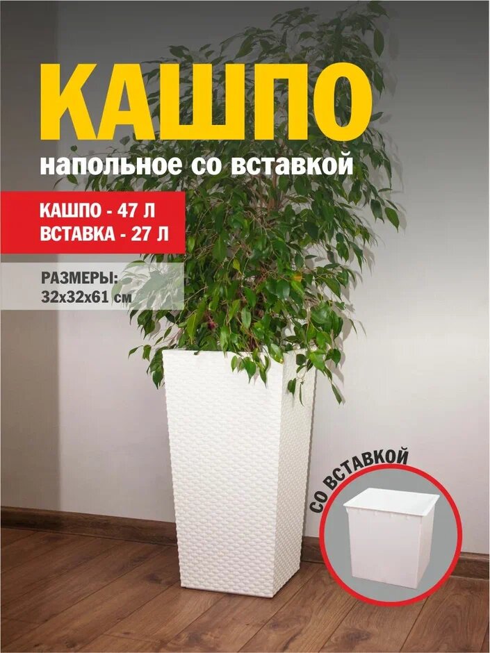 Кашпо напольное Альтернатива Ротанг, 32,5 x 32,5 x 61 см, со вставкой, белое
