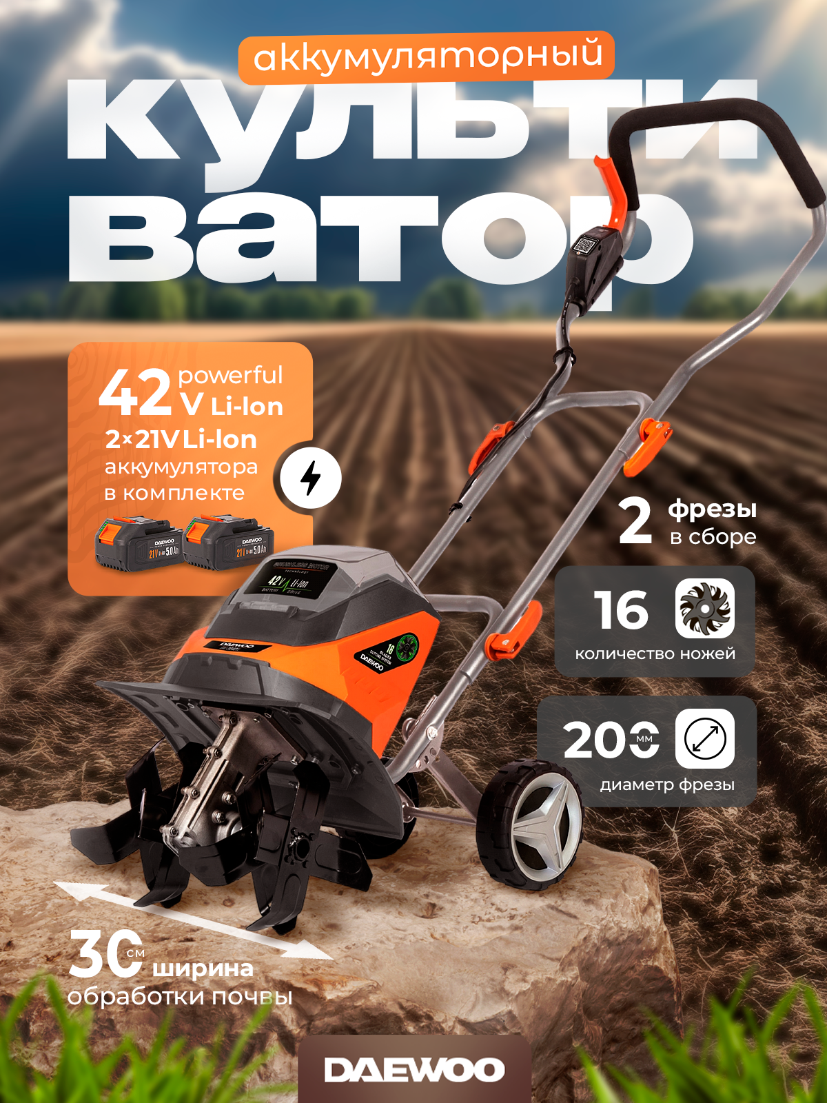 Купить Культиватор аккумуляторный DAEWOO DAT 3042Li SET с 2 АКБ 5 Ач и ЗУ