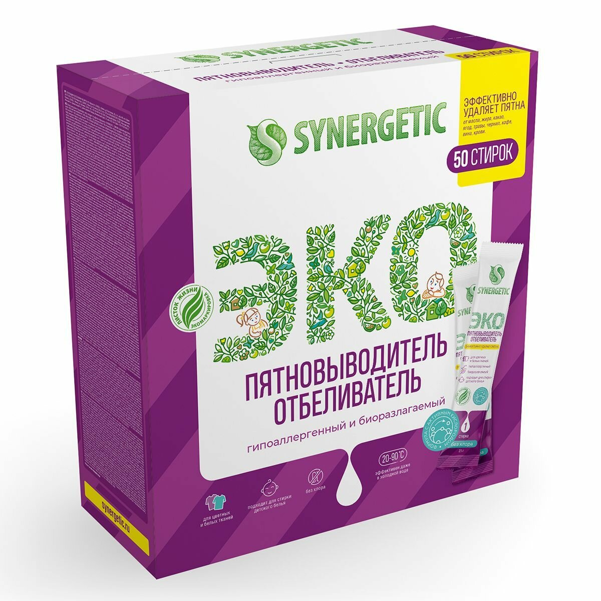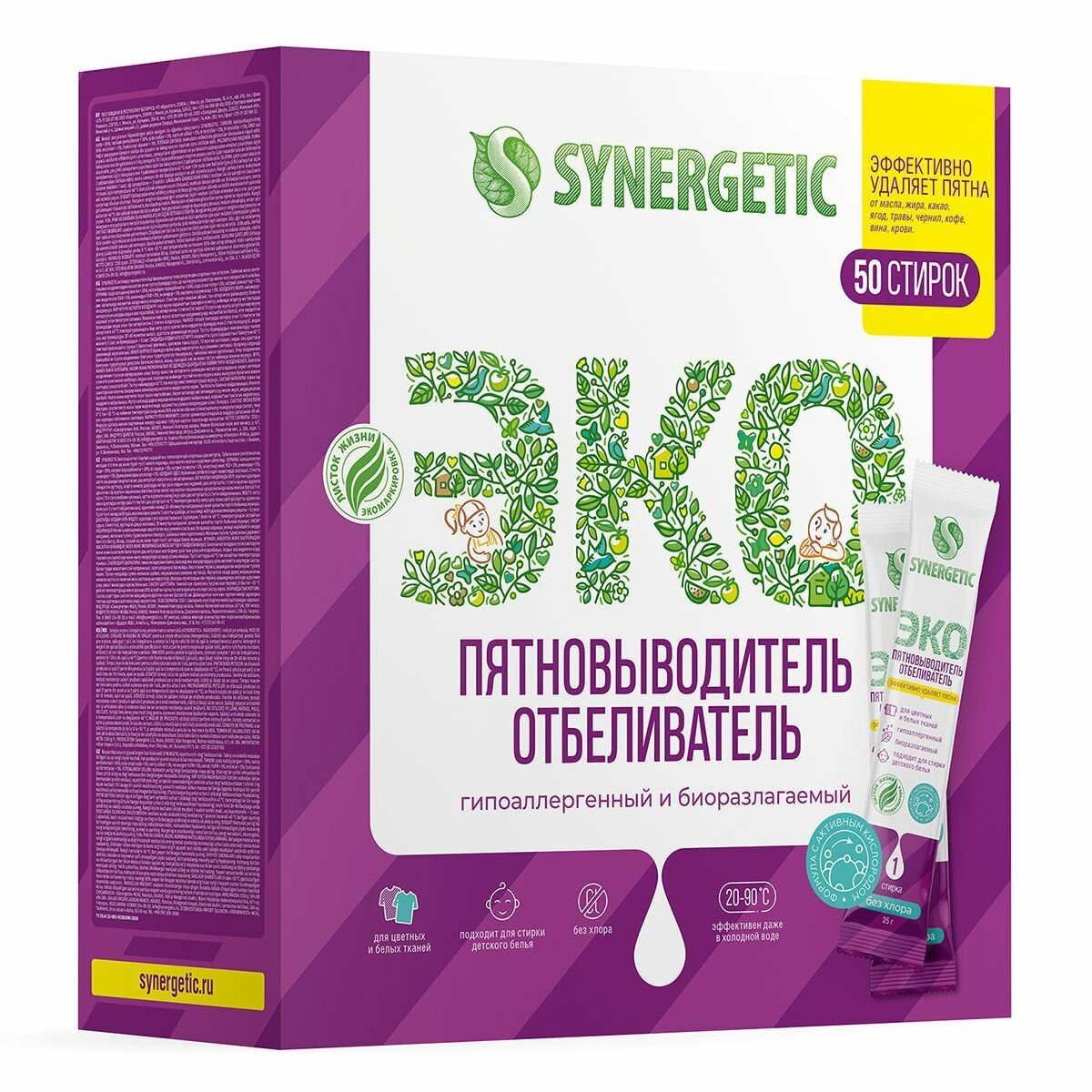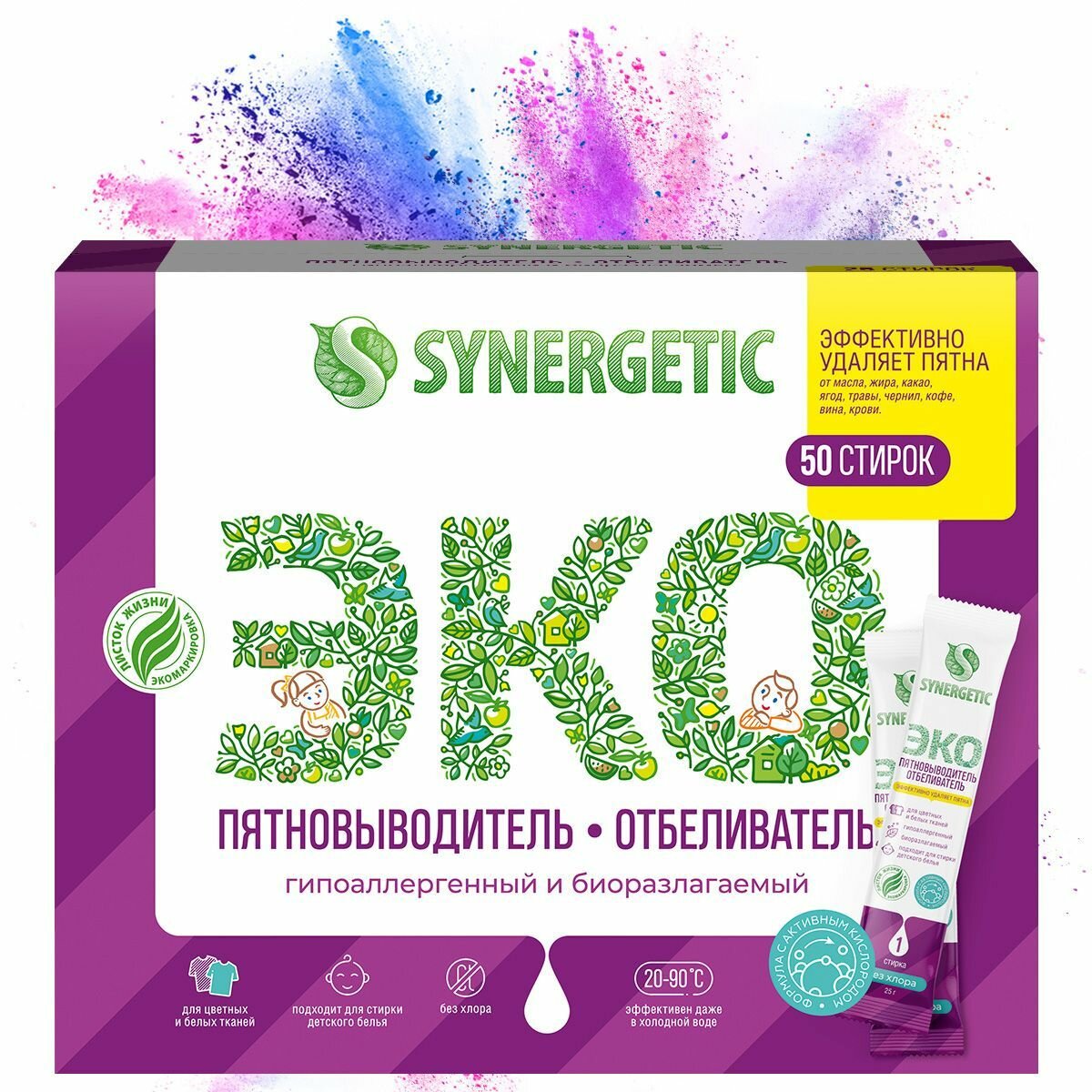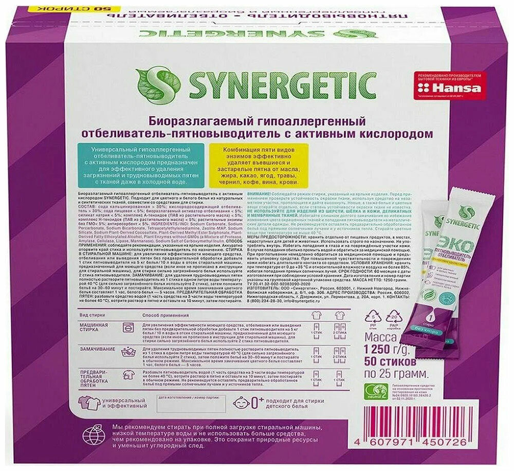 Отбеливатель-пятновыводитель Synergetic с активным кислородом, гипоаллергенный, биоразлагаемый, 25 стиков