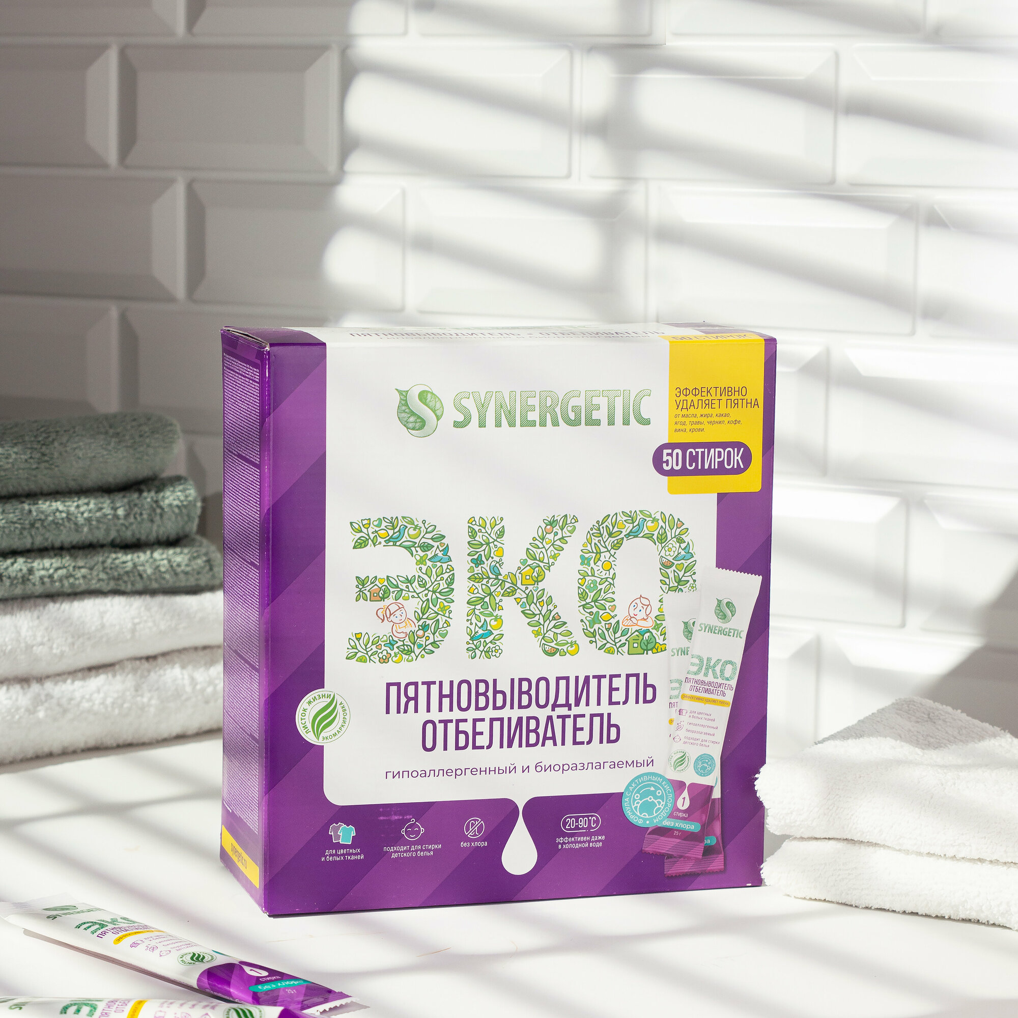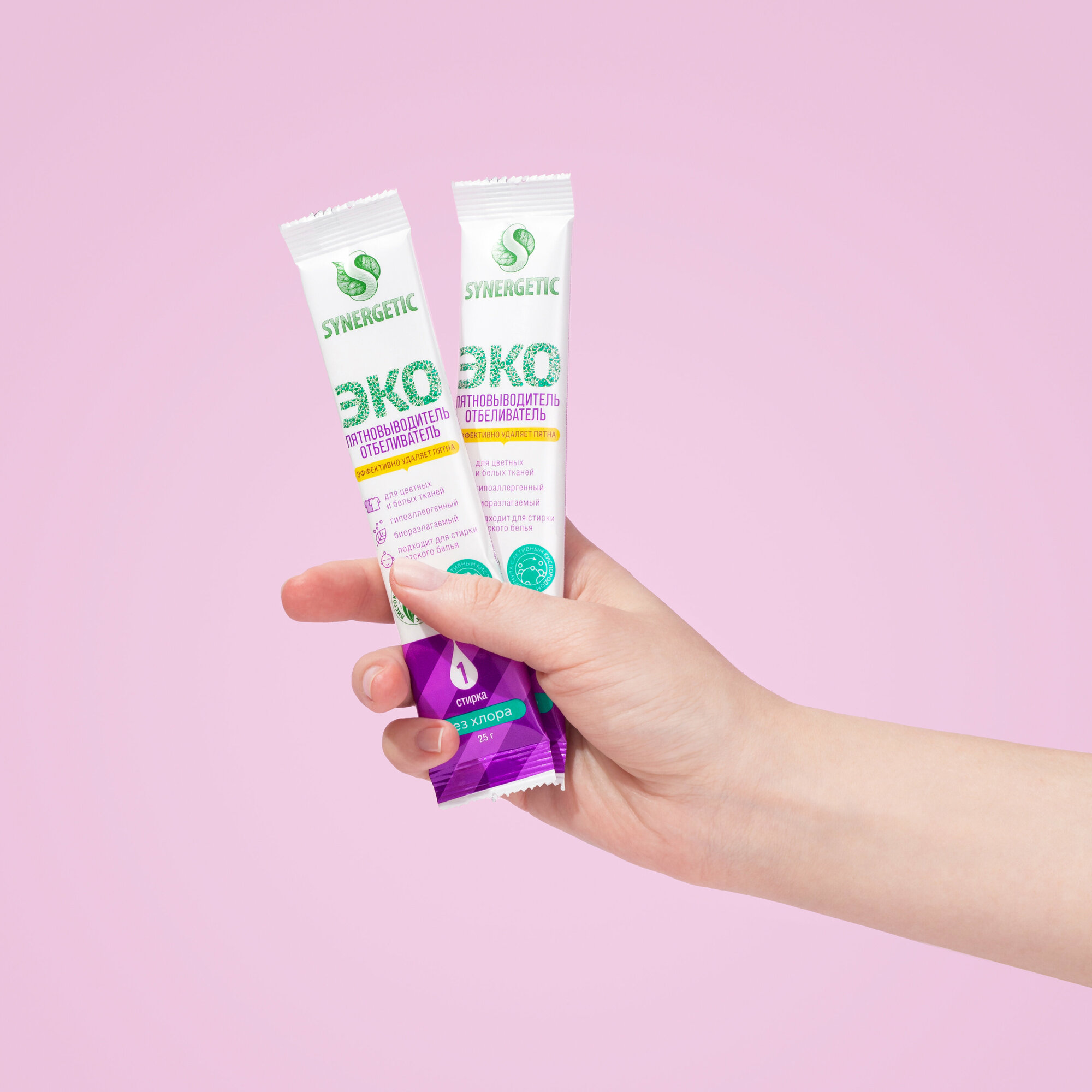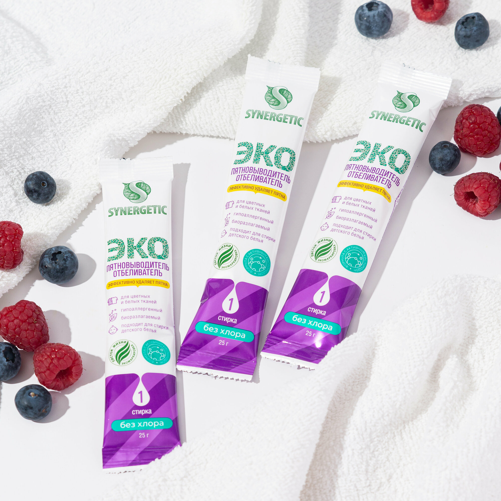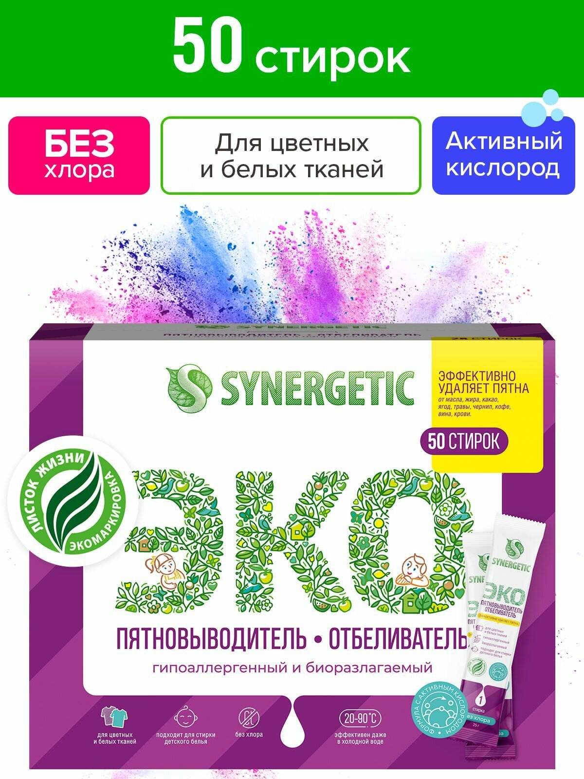 Отбеливатель-пятновыводитель Synergetic с активным кислородом, гипоаллергенный, биоразлагаемый, 25 стиков