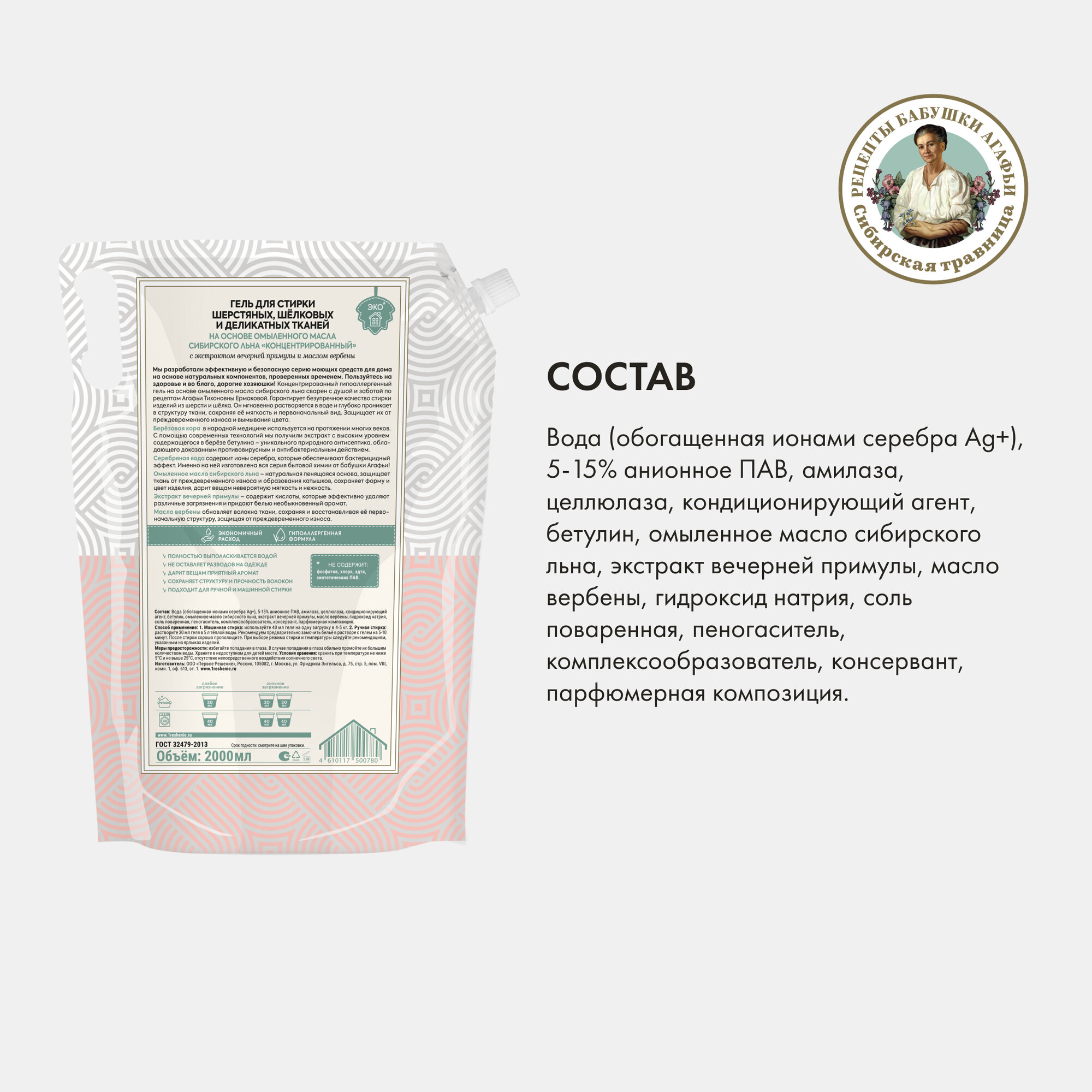 СохранитьГель для стирки Рецепты бабушки Агафьи Для Хозяюшек шерстянных шёлковых и деликатных тканей на основе омыленного масла льна Концентрированный, 2000 мл интересное: