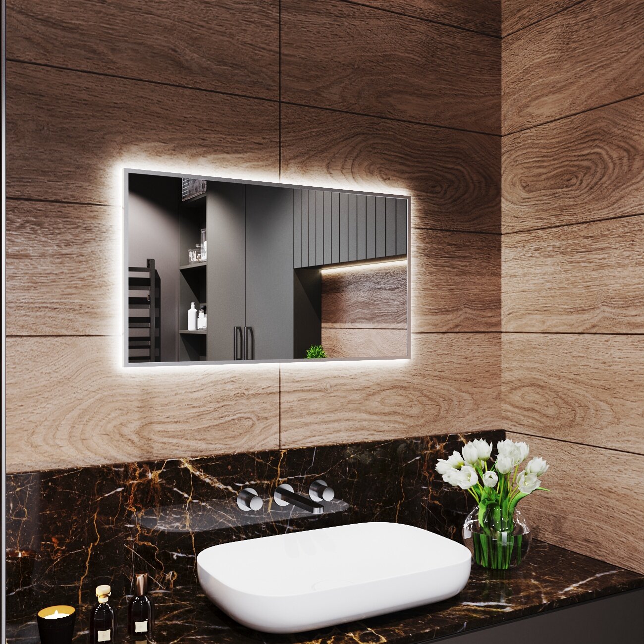 Зеркало с подсветкой в алюминиевой раме настенное Market-house 90х50 см. Свет: Нейтральный белый 6000К. Черное