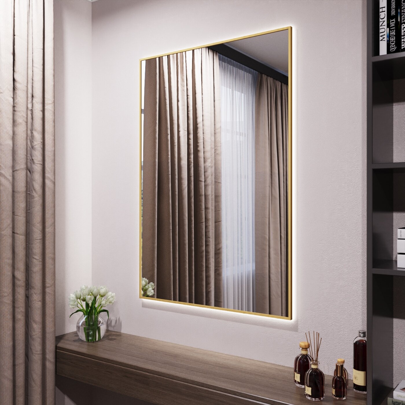 Зеркало с подсветкой в алюминиевой раме настенное Market-house 60х40 см. Свет: Нейтральный белый 6000К. Золото