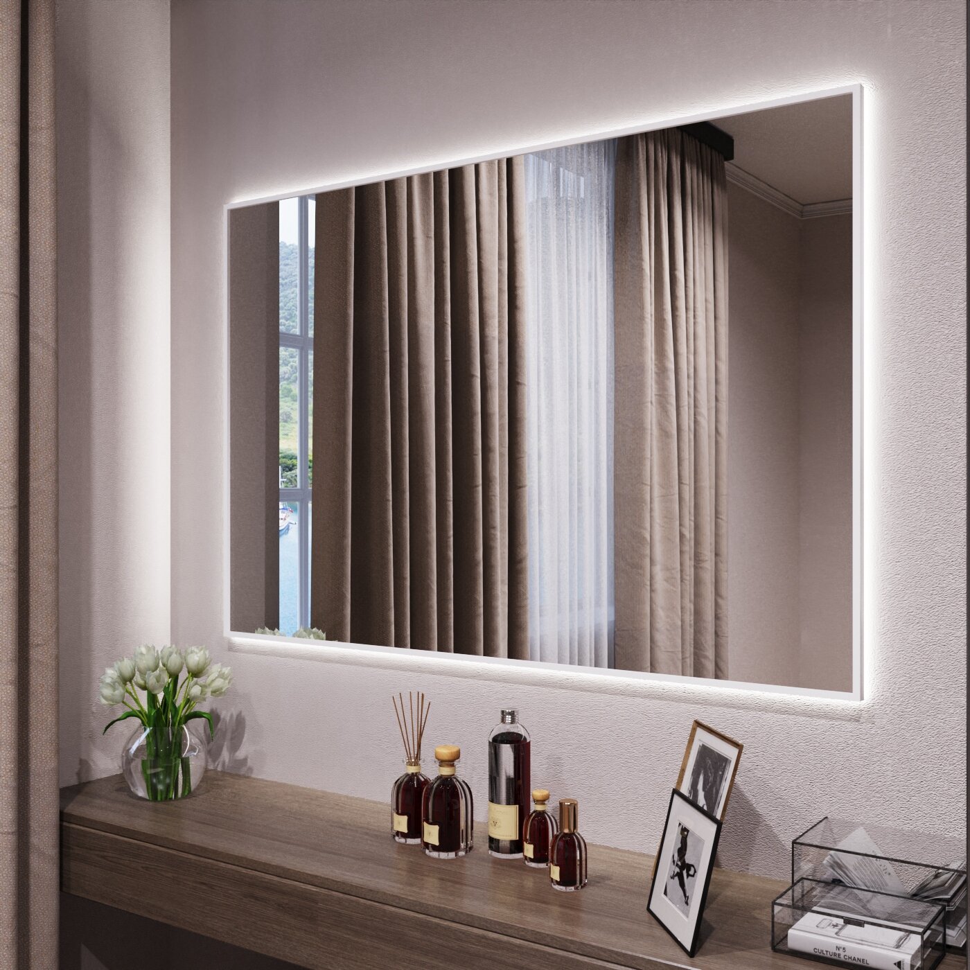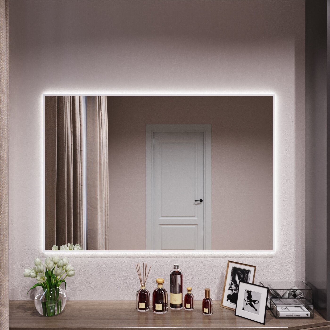 СохранитьЗеркало с подсветкой в алюминиевой раме настенное Market-house 130х90 см. Свет: Нейтральный Белый 6000К. Белое интересное: