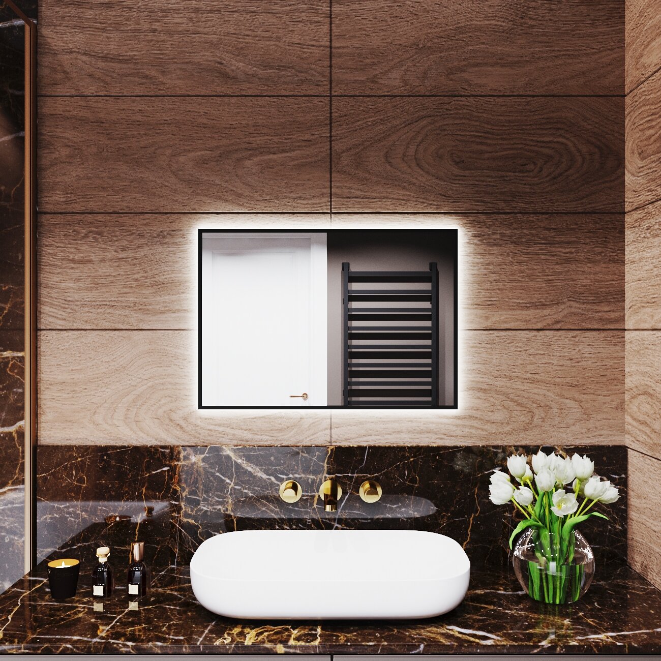 Зеркало с подсветкой в алюминиевой раме настенное Market-house 70х40 см. Свет: Нейтральный белый 6000К. Черное