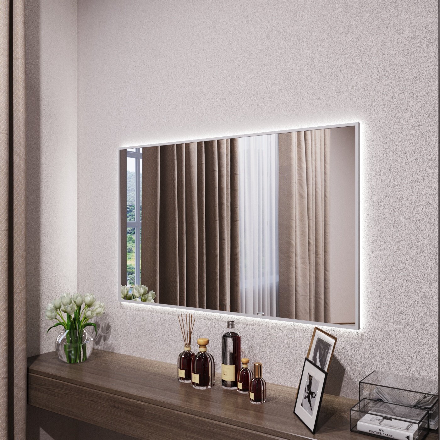 Зеркало с подсветкой в алюминиевой раме настенное Market-house 140х90 см. Свет: Нейтральный Белый 6000К. Серебро