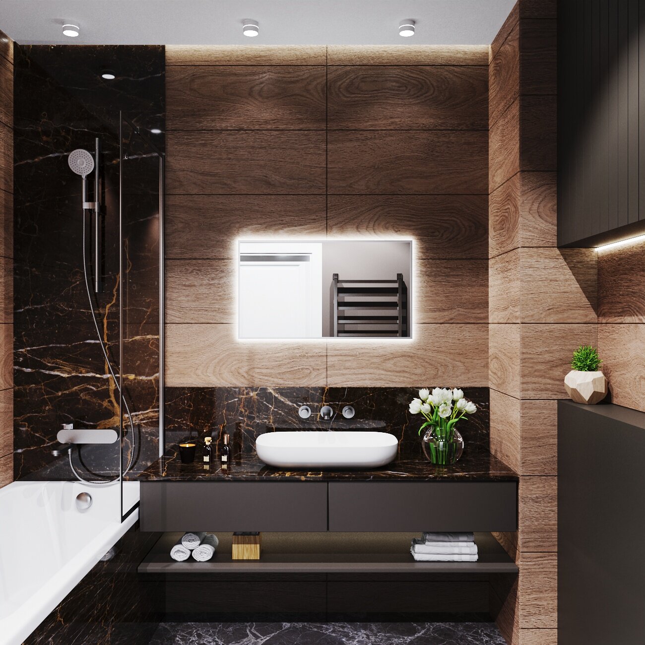 Зеркало с подсветкой в алюминиевой раме настенное Market-house 100х90 см. Свет: Нейтральный Белый 6000К. Черное