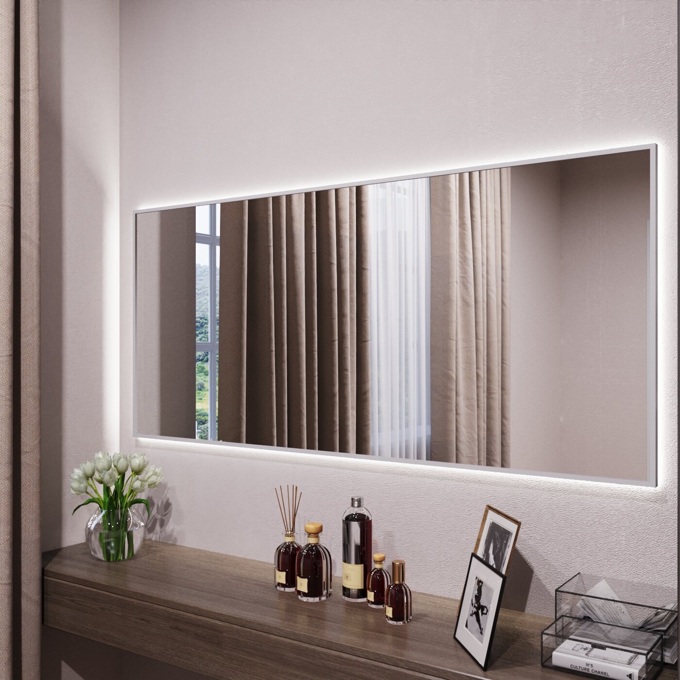 Зеркало с подсветкой в алюминиевой раме настенное Market-house 130х50 см. Свет: Нейтральный Белый 6000К. Серебро