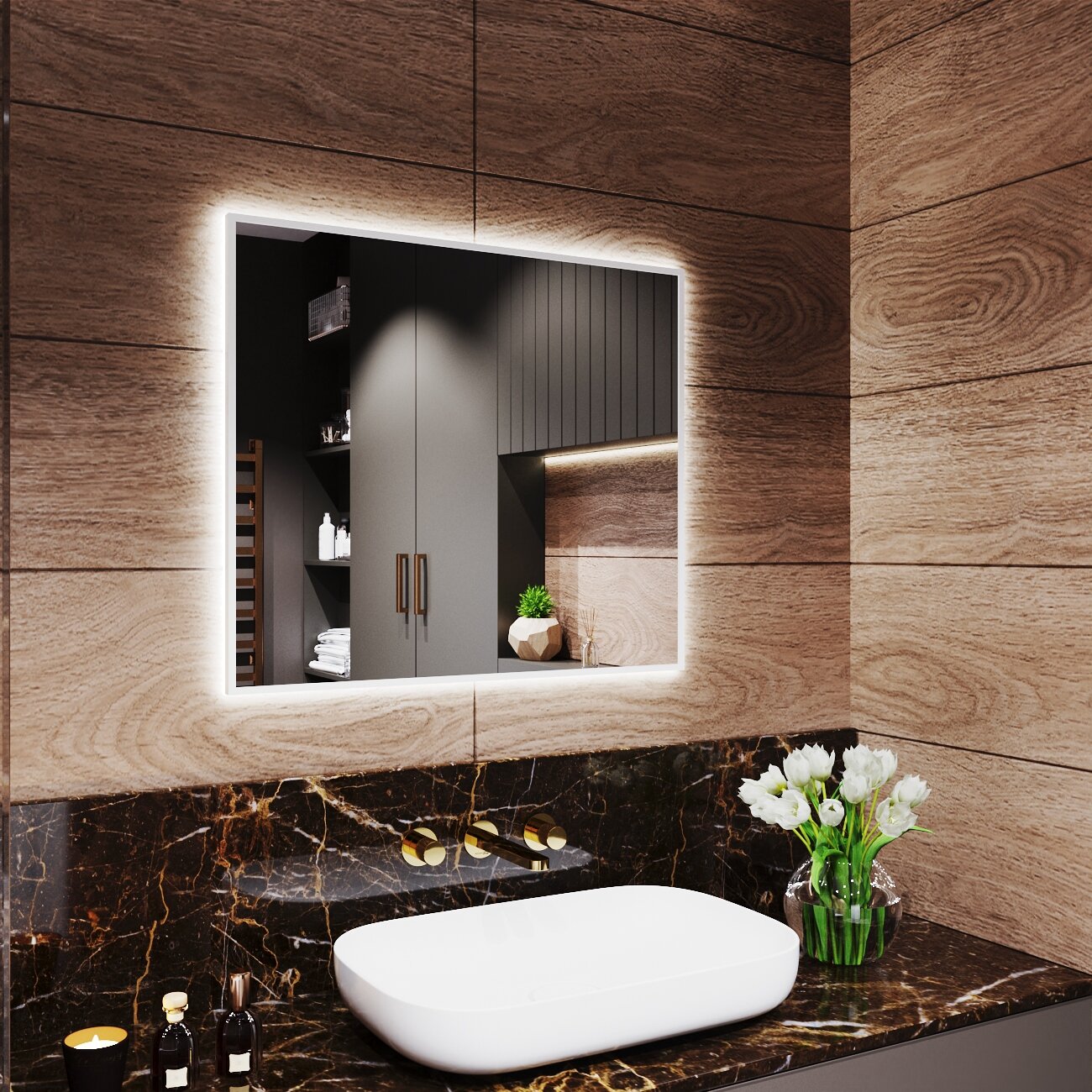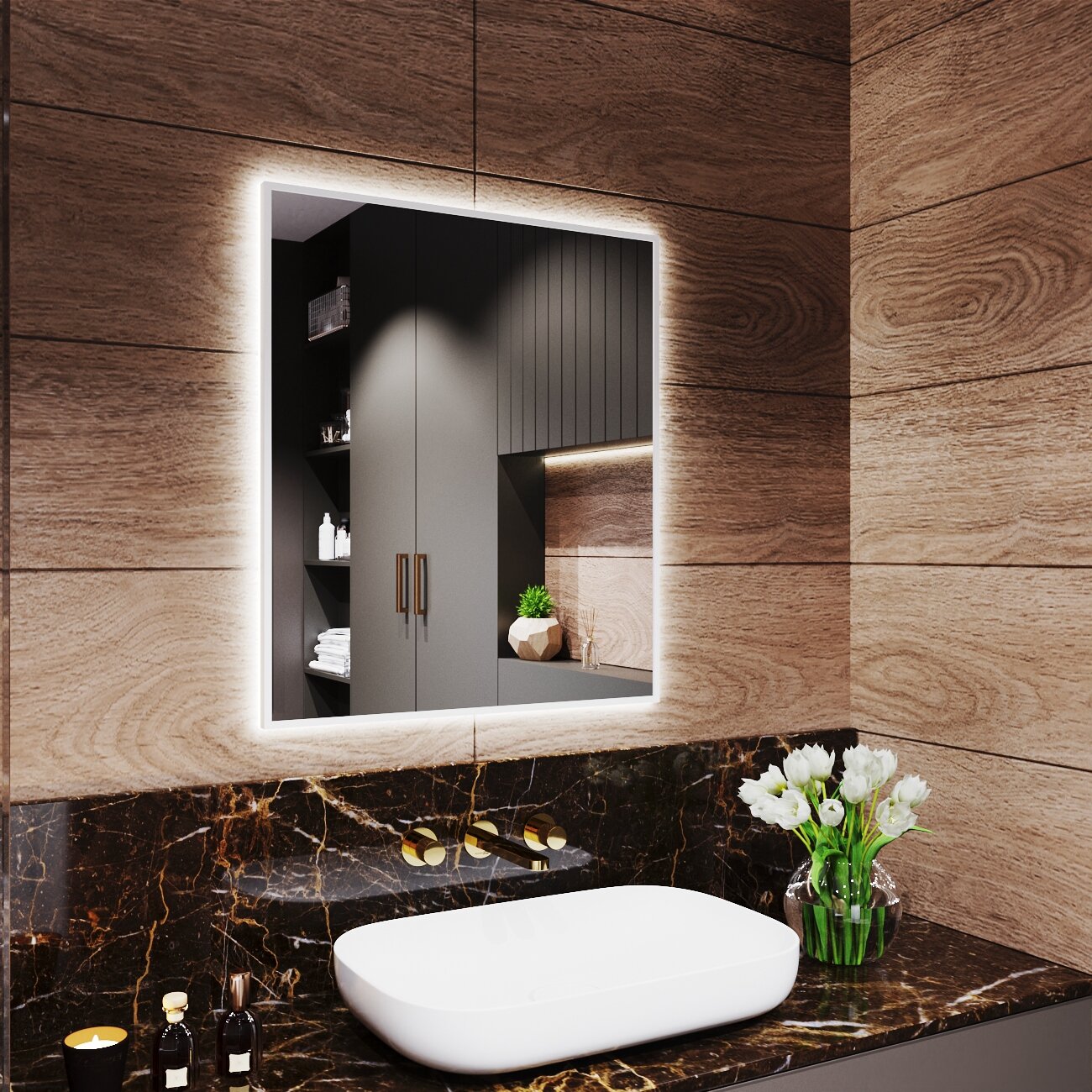 СохранитьЗеркало с подсветкой в алюминиевой раме настенное Market-house 80х70 см. Свет: Нейтральный Белый 6000К. Белое интересное:
