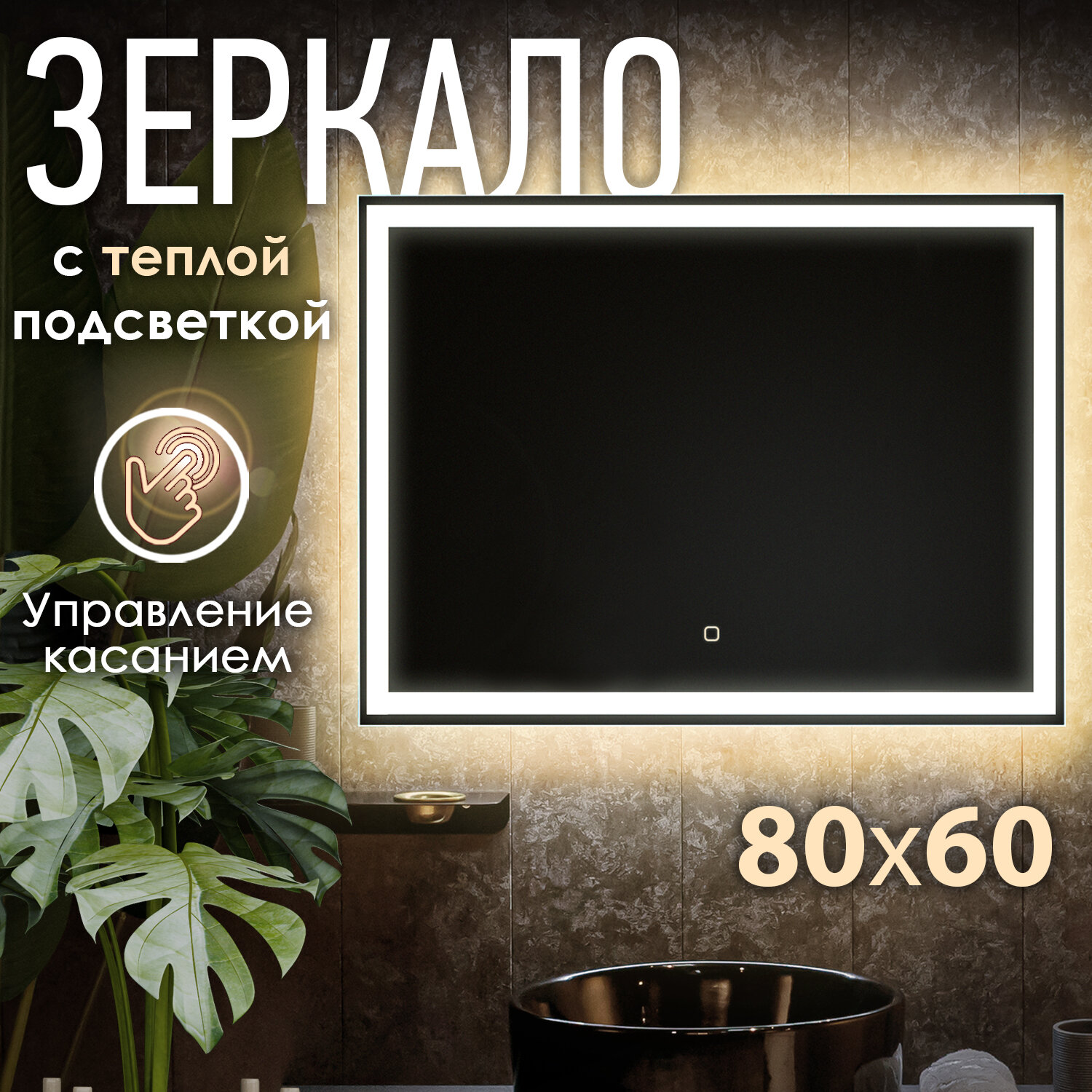 Зеркало с LED подсветкой OBERIAL 80x60см (тёплый свет 3000К, прямоугольное настенное для ванной сенсорное выключение) интересное: