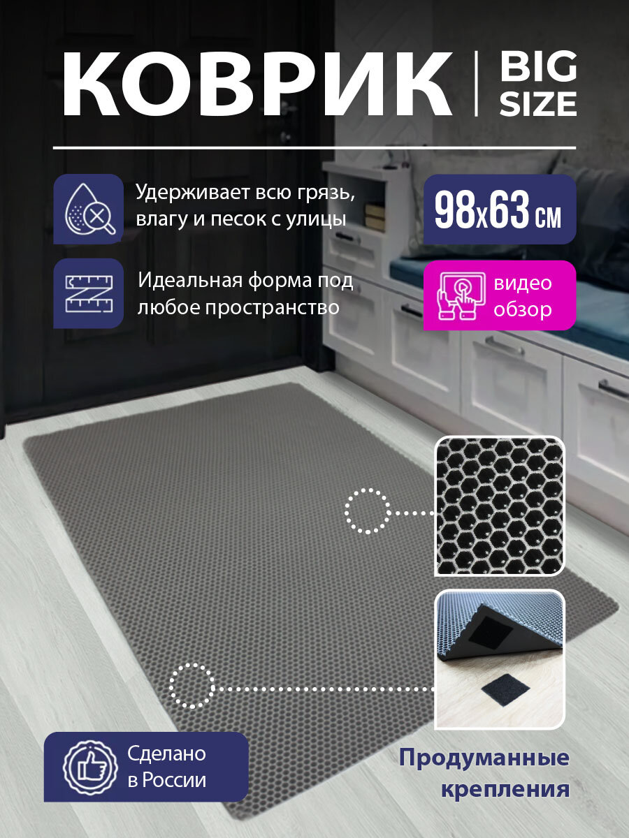 Коврик придверный в прихожую EVA, коврик грязезащитный резиновый соты, коврик для входной двери в коридор ЕВА с липучкой, 98х63 см Серый интересное: