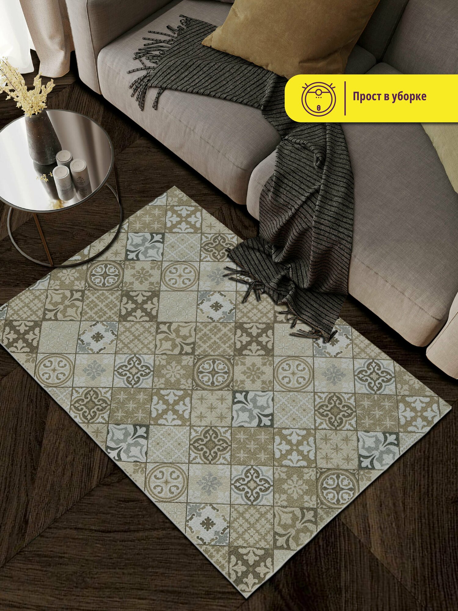Коврик придверный вырезной PRINT 100х150 Плитка Карфаген бежевый с серым, коврик прикроватный