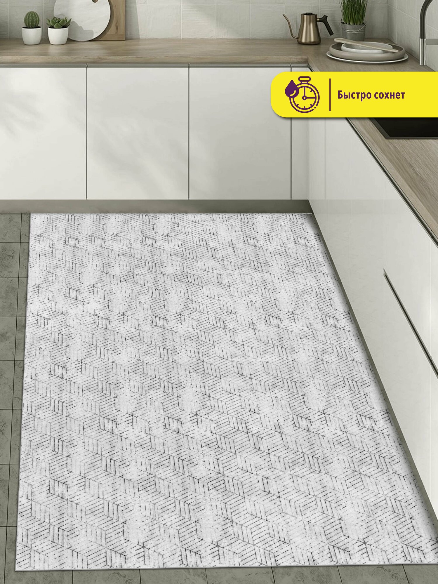Вырезной придверный коврик. Коврик в прихожую антискользящий влаговпитывающий PRINT /размер 150х200см/ Плитка Карфаген бежевый с серым, коврик прикроватный, для кухни, для ванной