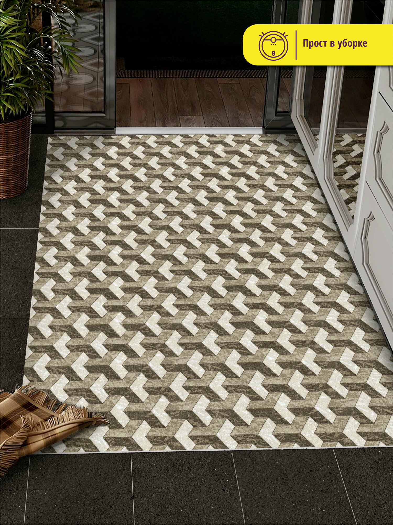 Коврик придверный вырезной Icarpet PRINT/ 100х150 см/ 3D Куб серо-бежевый, коврик прикроватный, коврик для кухни, для ванной