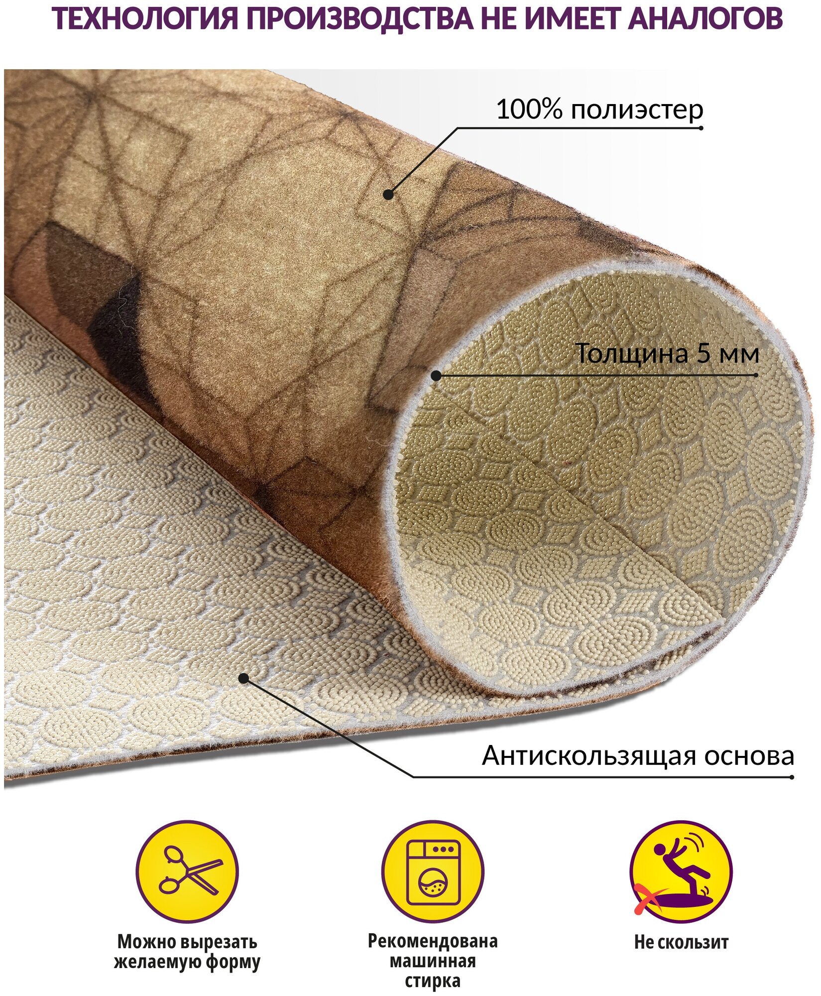 Коврик придверный, прикроватный, вырезной Icarpet PRINT /100х150 см/ Иллюжн бежево-коричневый, коврик прикроватный для кухни, для ванной