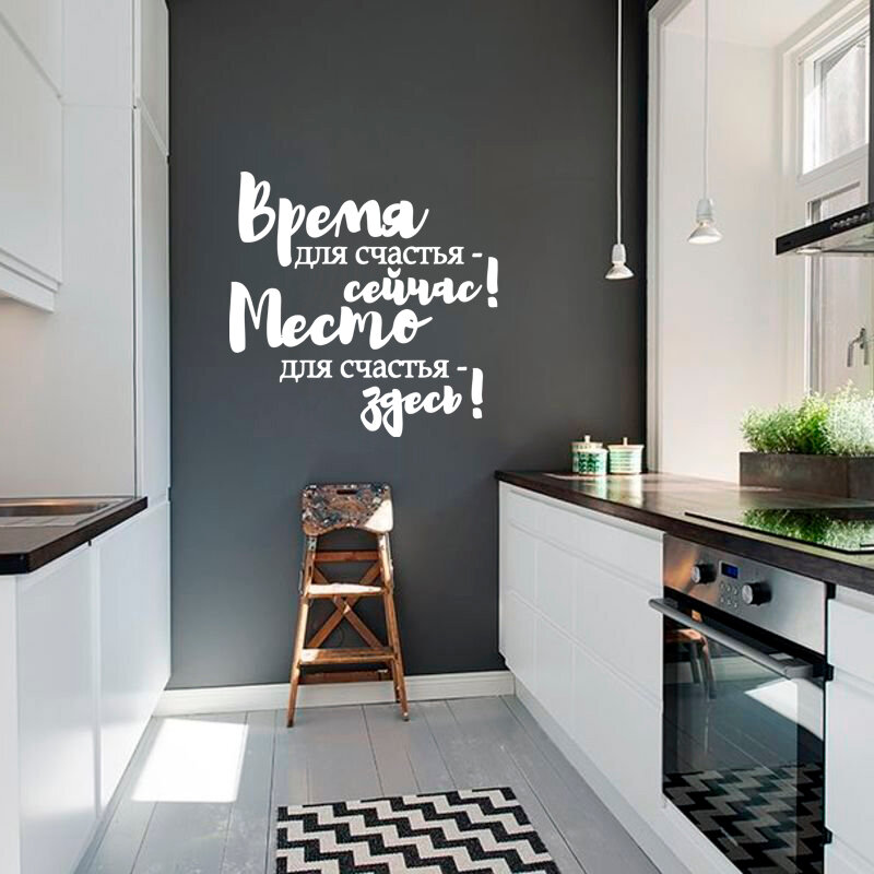 Наклейка большая интерьерная белая Наклейка Орен надпись "Время для счастья - сейчас! Место для счастья - здесь!" на стены, стекло, мебель интересное: