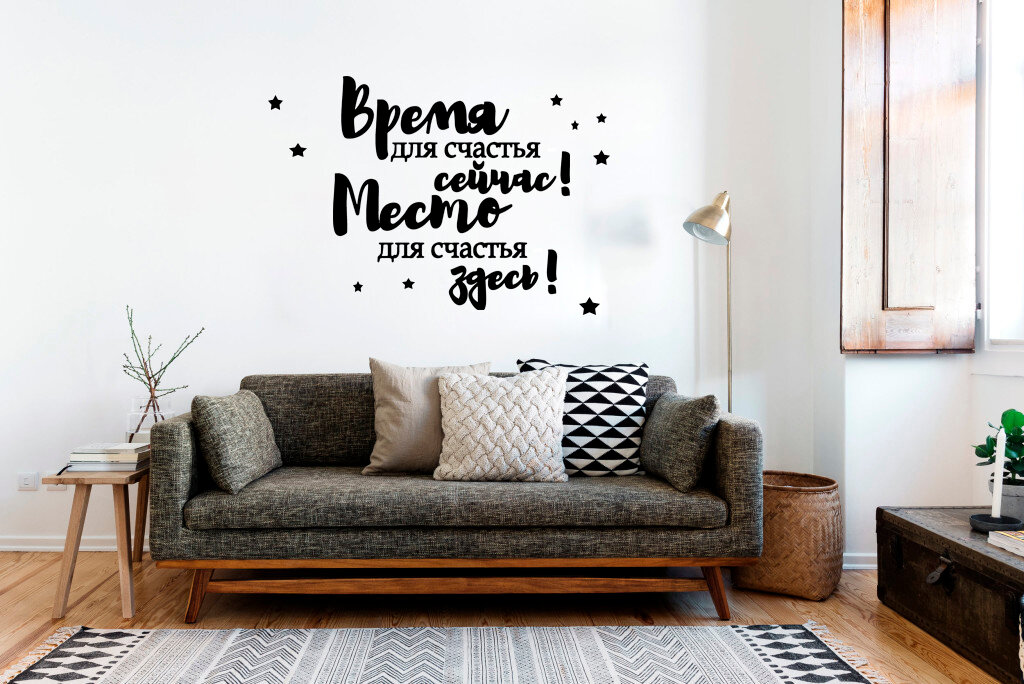 Наклейка на стену большая "Время для счастья - сейчас, место для счастья - здесь!", наклейка интерьерная, стикер на стекло, мебель, стену интересное:
