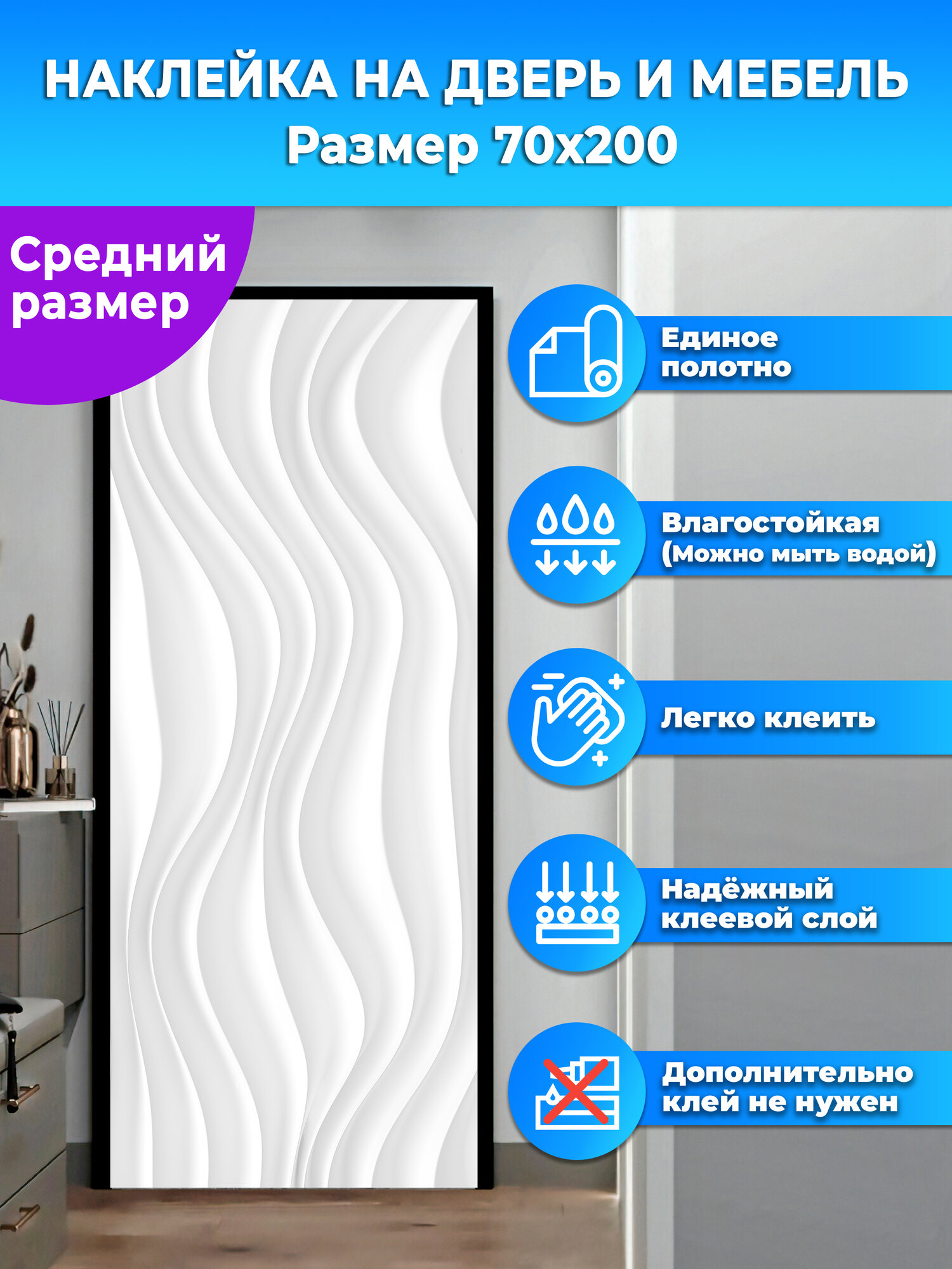 Наклейка интерьерная на дверь "Барельеф волны", самоклеющаяся 70х200 см. интересное: