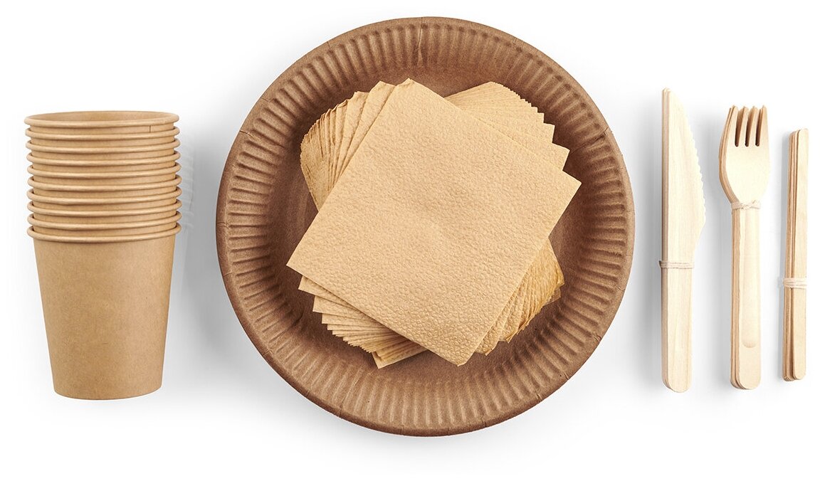 Одноразовая посуда для праздника (тарелки, стаканчики, вилки, ножи) крафт набор на 10 персон