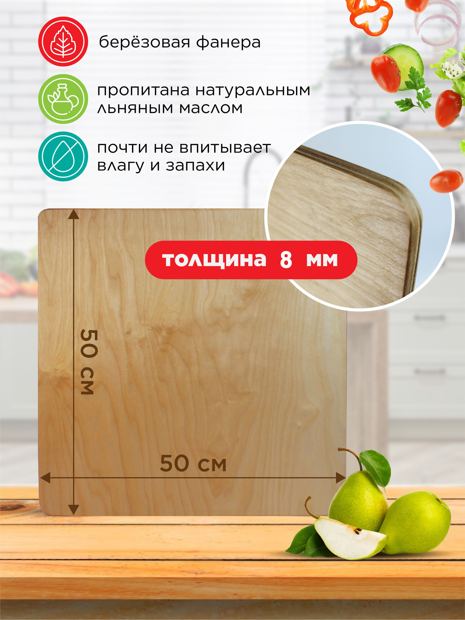 | Подробная комплектация | Разделочная доска из фанеры (берёза) 50 см на 50 см - 1 штука. |