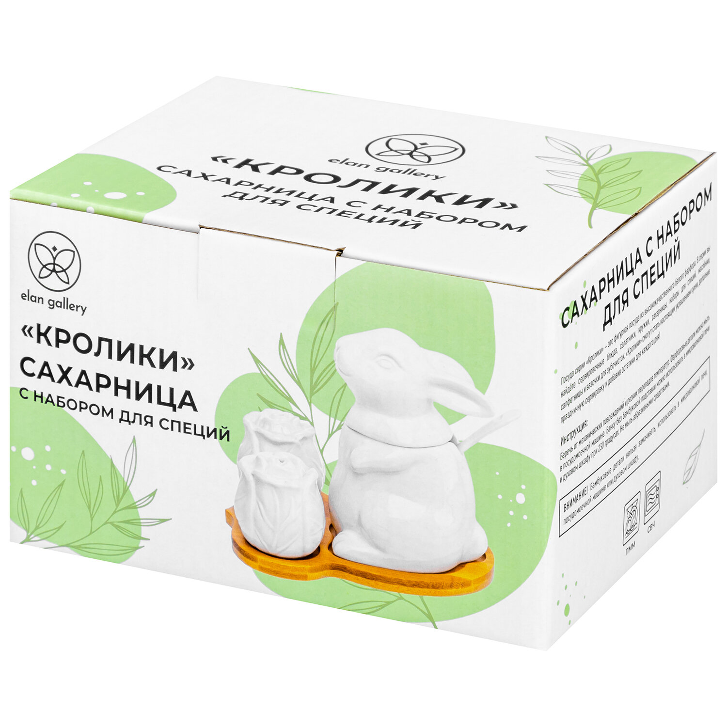 Набор - сахарница 200 мл 15,5х11,5х13 см Elan Gallery Заяц с капустой, с ложкой, с солонкой и перечницей на дер. подставке интересное: