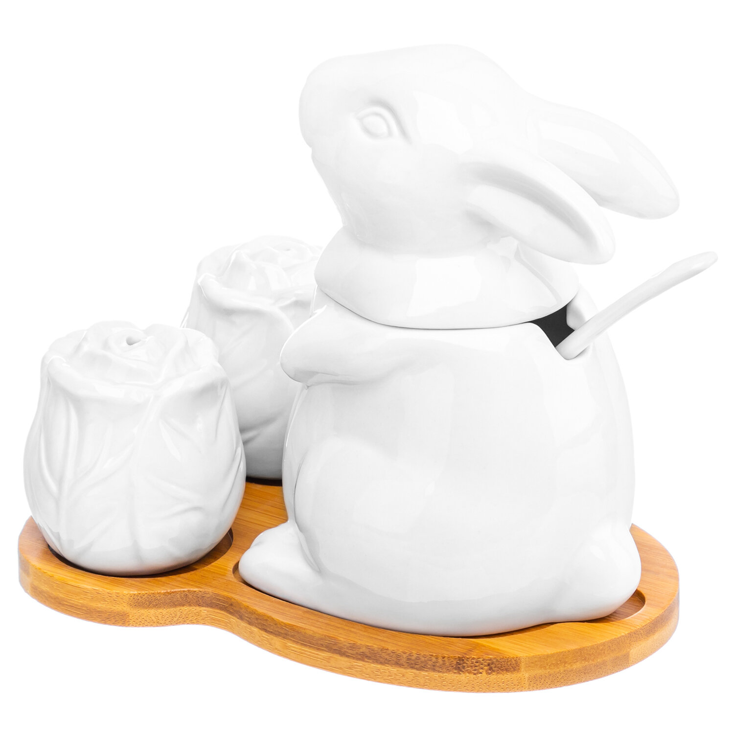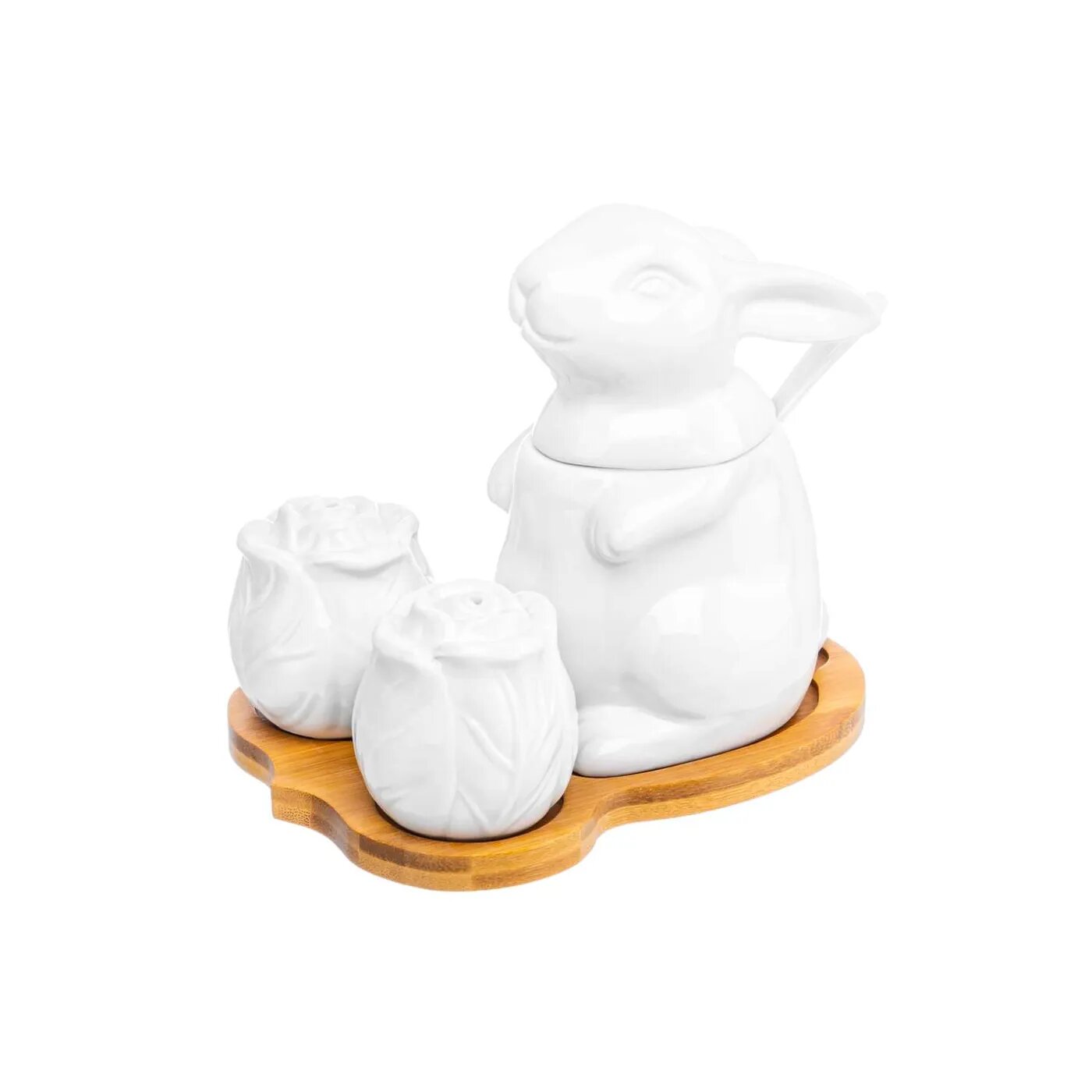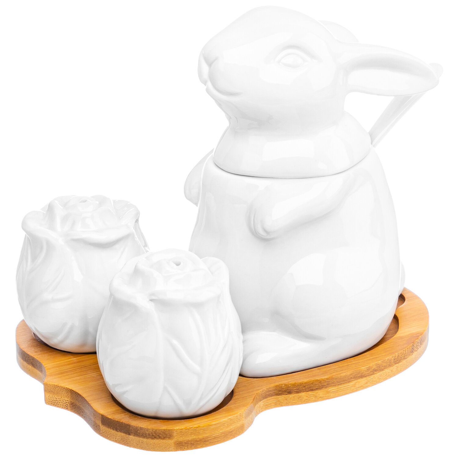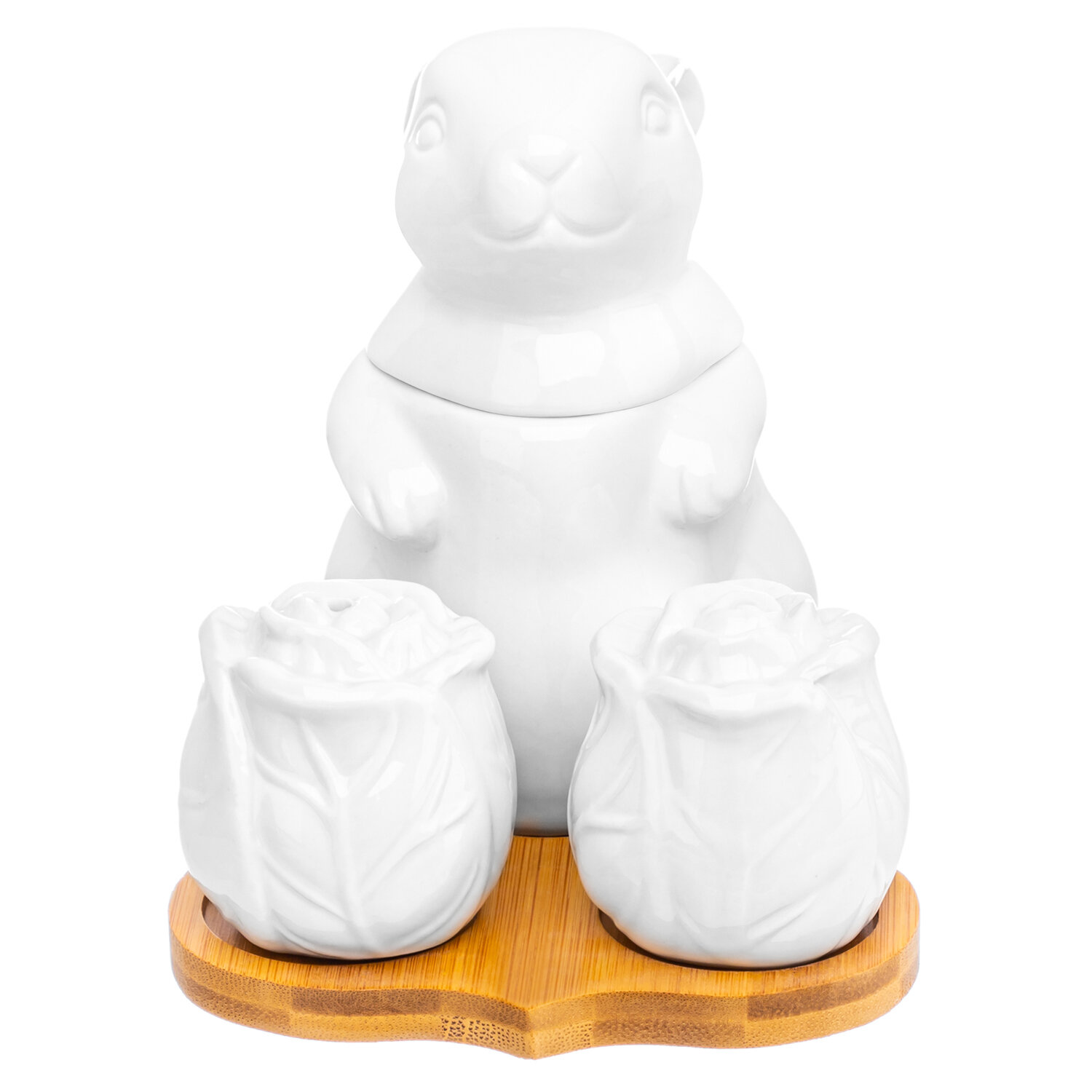 | Дополнительная информация | Набор фарфоровый "Заяц с капустой" 15,5*11,5*13 см, сахарница 9*8*12,5 см 200 мл с ложкой и крышкой, высота без крышки 7 см, солонка и перечница - 5,2*5,2*5,2 см 45 мл - каждая, на деревянной подставке 15,5*11,5*1 см |