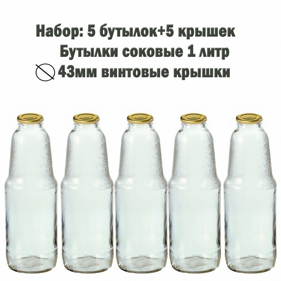 Купить Бутылки стеклянные соковые 1 литр твист-офф ТО-43 с крышками 5 шт (156179)