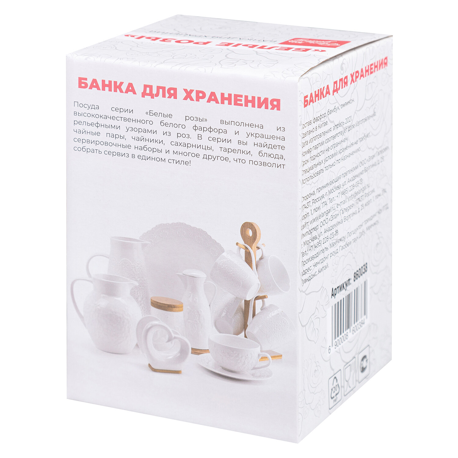 | Дополнительная информация | Банка для сыпучих продуктов "Белые розы" 11х11х16 см, 1 л, с деревянной крышкой с силиконовым уплотнителем (для чая и кофе) |