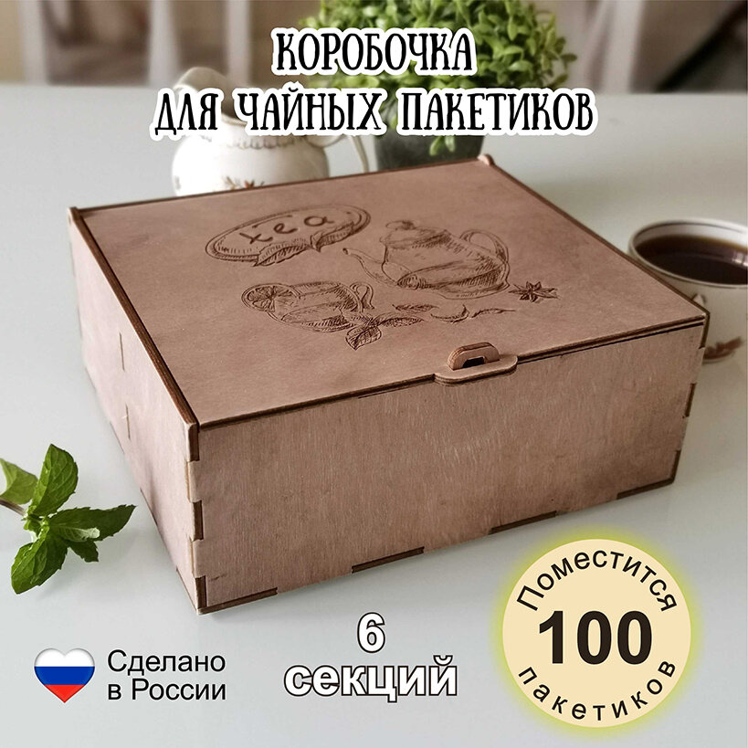 Деревянная коробка для чайных пакетиков, 6 секций с откидной крышкой, с гравировкой интересное: