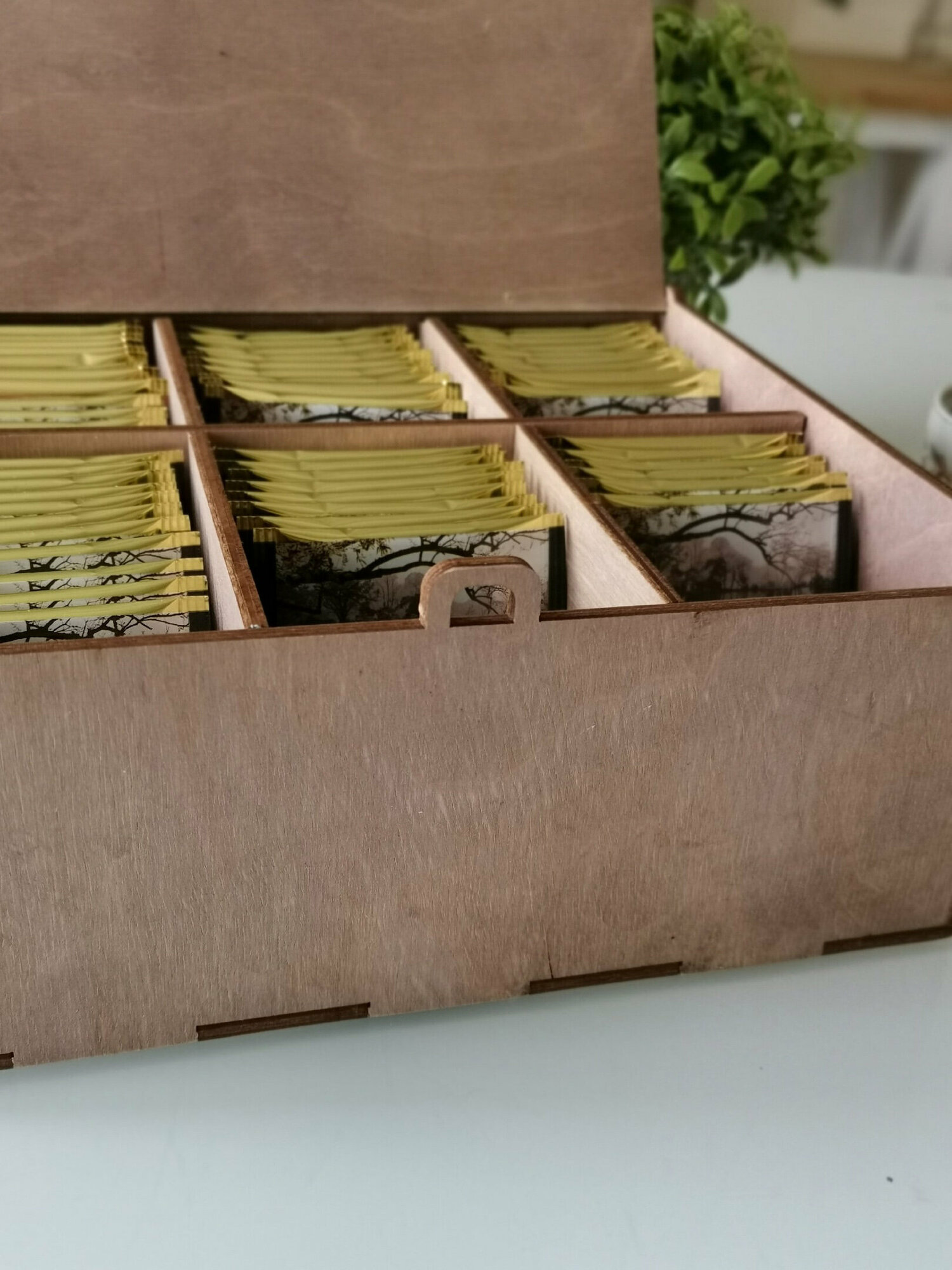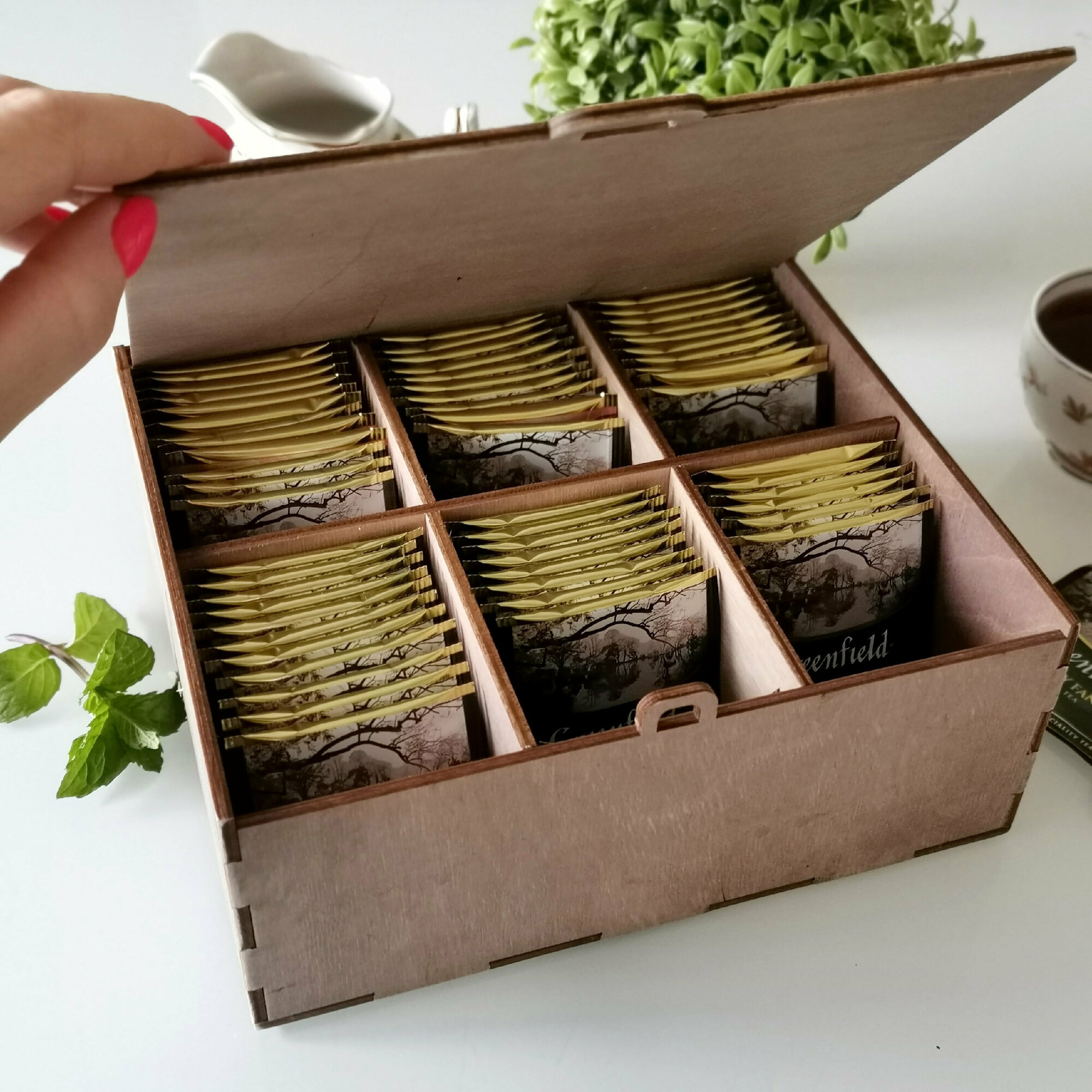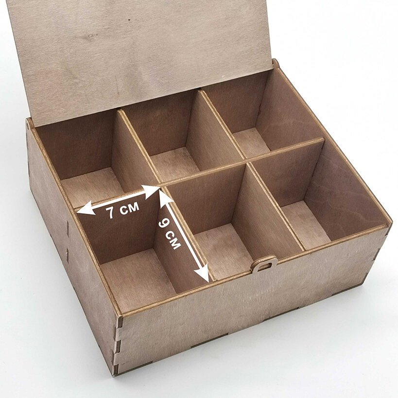 Купить Деревянная коробка для чайных пакетиков, 6 секций с откидной крышкой, с гравировкой