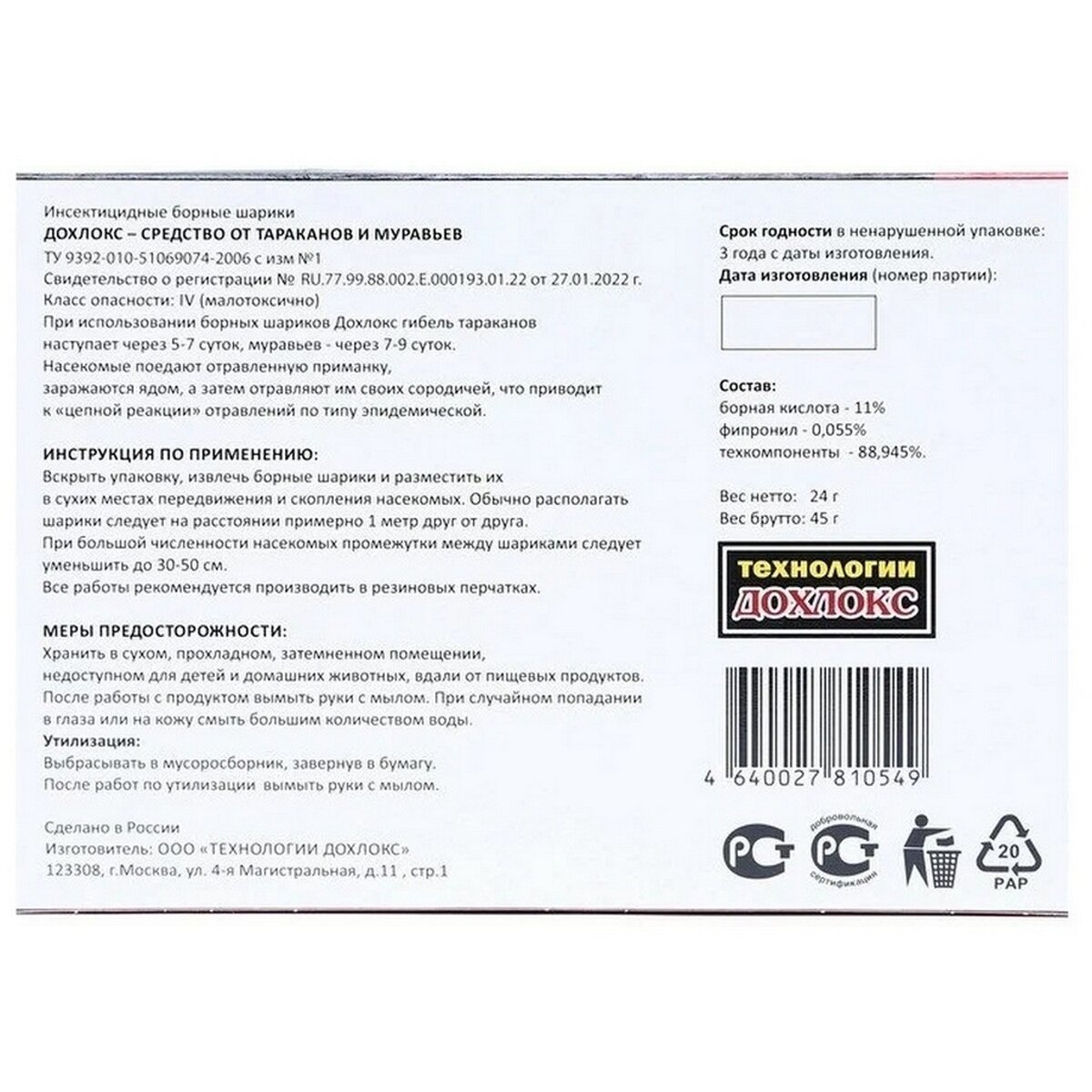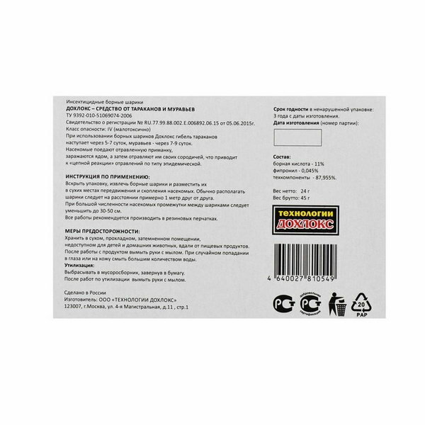 | Подробная комплектация | Дохлокс, Борные шарики от тараканов и муравьев, 8 шариков |