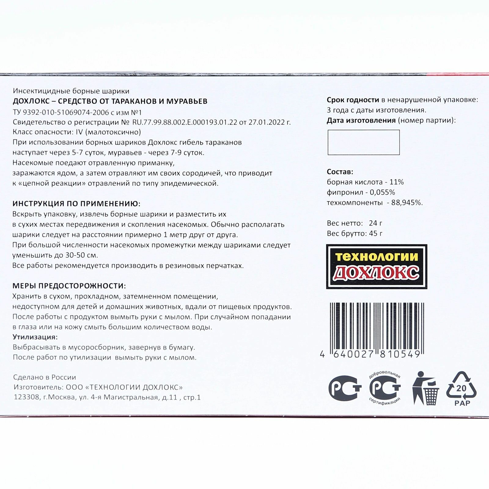 | Состав | вспомогательные компоненты 87,955%, фипронил 0,045% , борная кислота -11% |