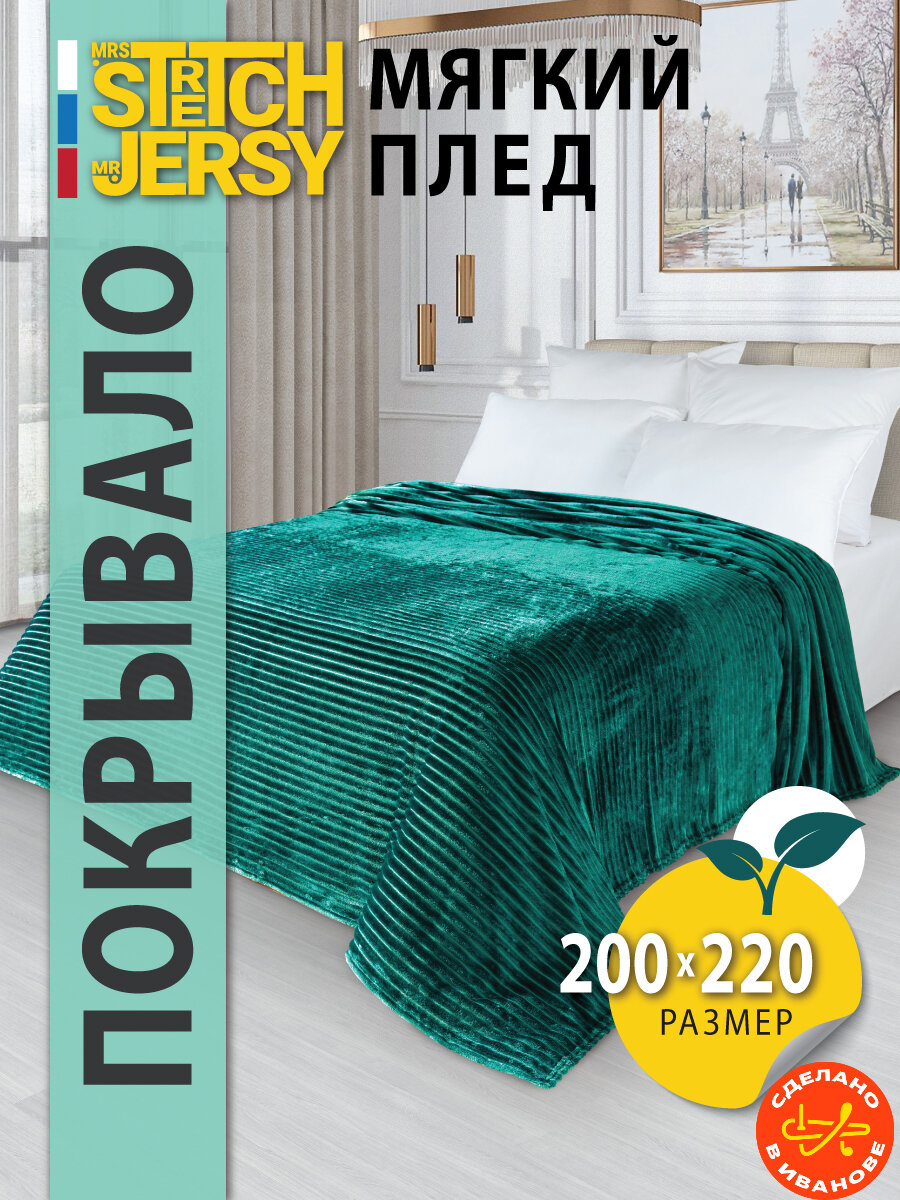 Купить Плед-покрывало "Stretch Jersy" 200 x 220, мягкий и теплый, велсофт, изумрудный