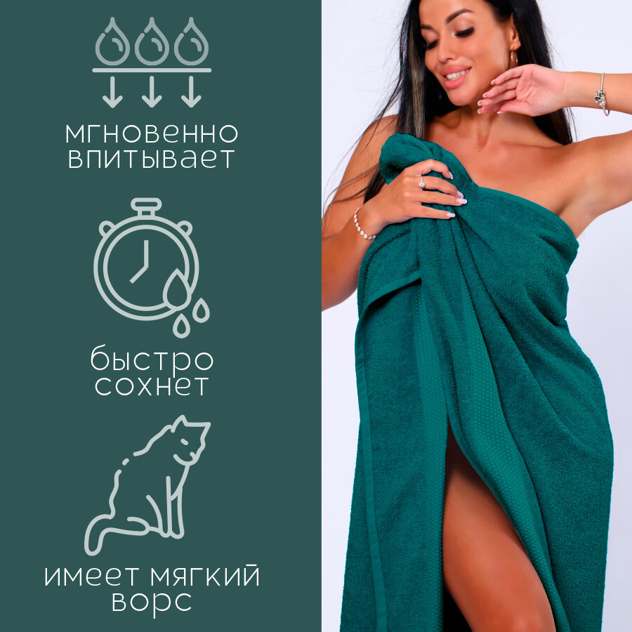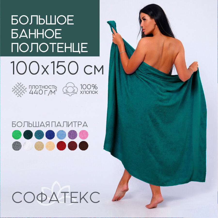 Полотенце банное махровое 100% хлопок Софатекс 100х150 для ванны и душа, цвет изумрудный